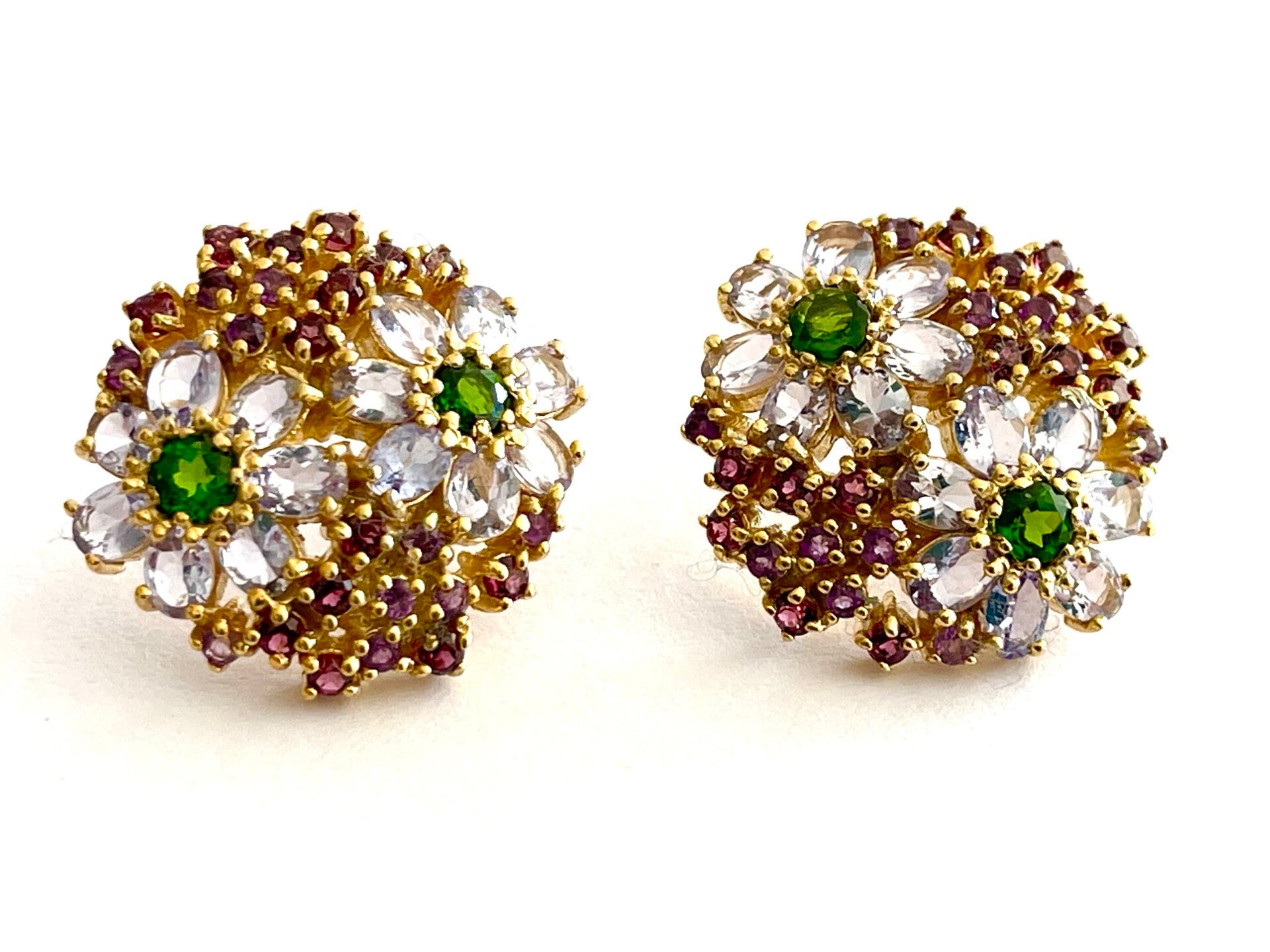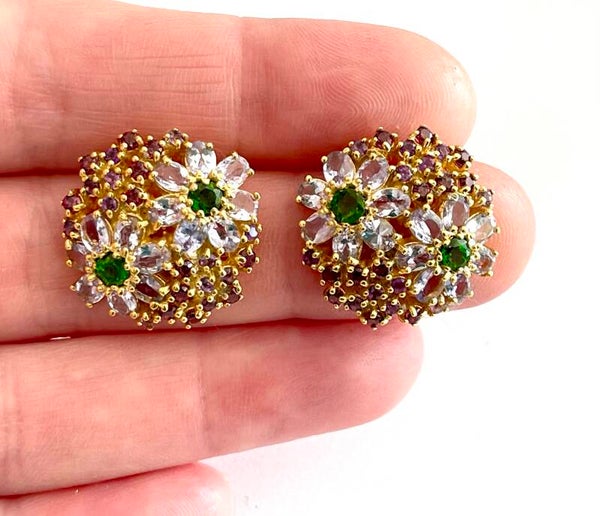 Deze prachtige zilveren oorbellen zijn bezet met amethist, chromium diopside, rhodoliet en tanzaniet.