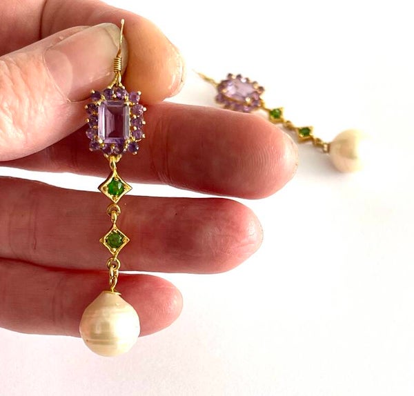 Prachtige zilveren oorbellen met vergulde details zijn bezet met Barok parels, amethist en Smaragd