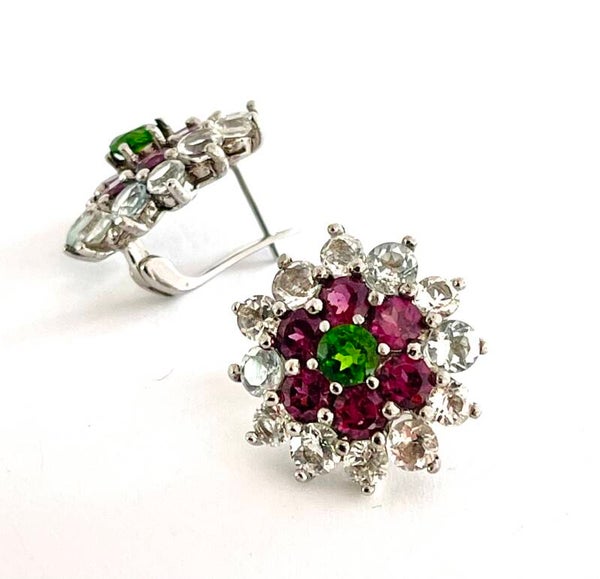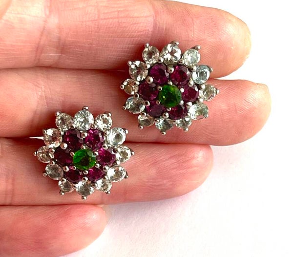Deze prachtige Zilveren oor stekers zijn bezet met Rhodoliet, Aquamarijn en Chromium Diopside