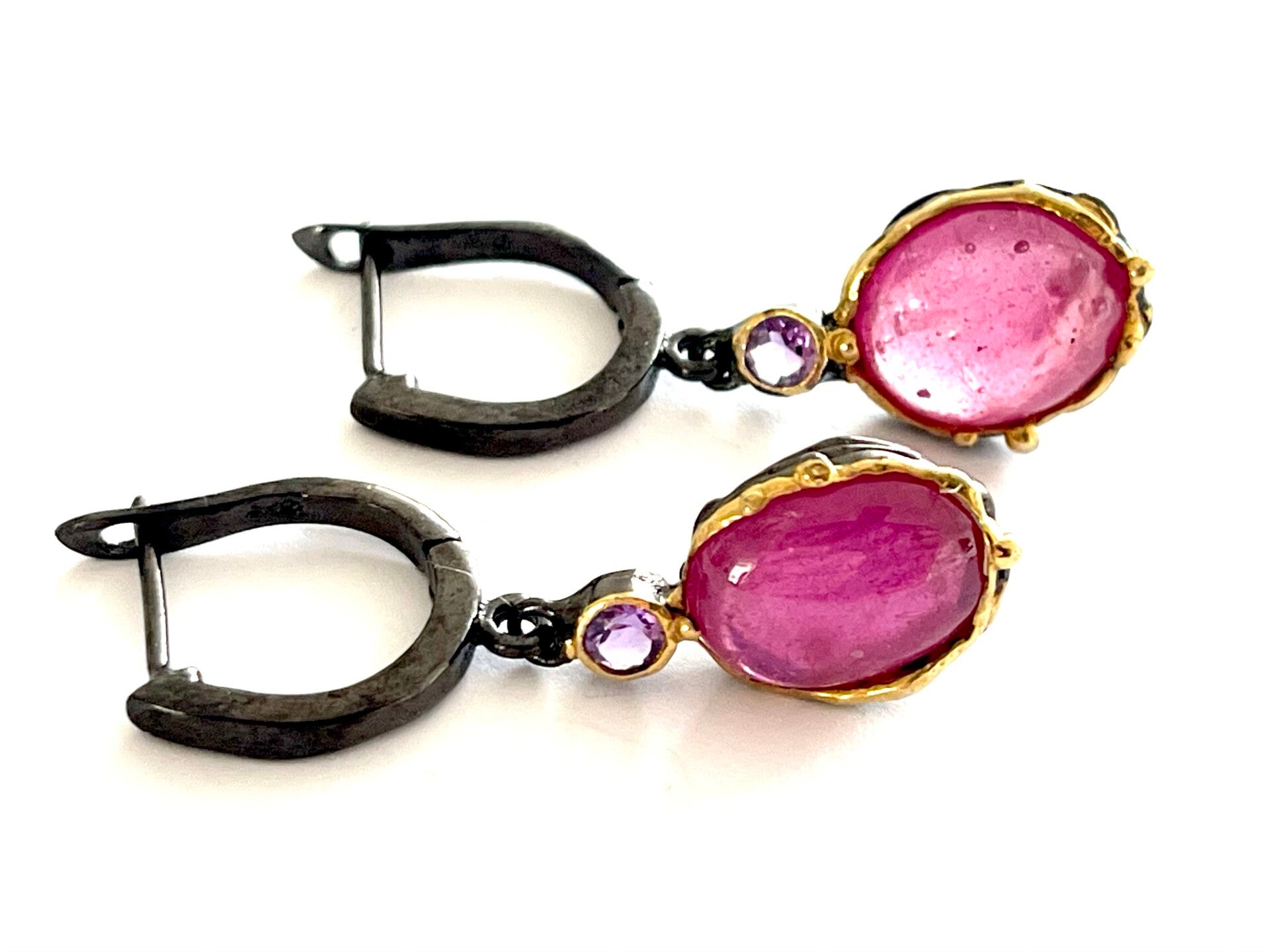 Deze prachtige zwart gerhodineerde Zilveren oorbellen met vergulden accenten zijn bezet met een Tourmalijn en Amethist.