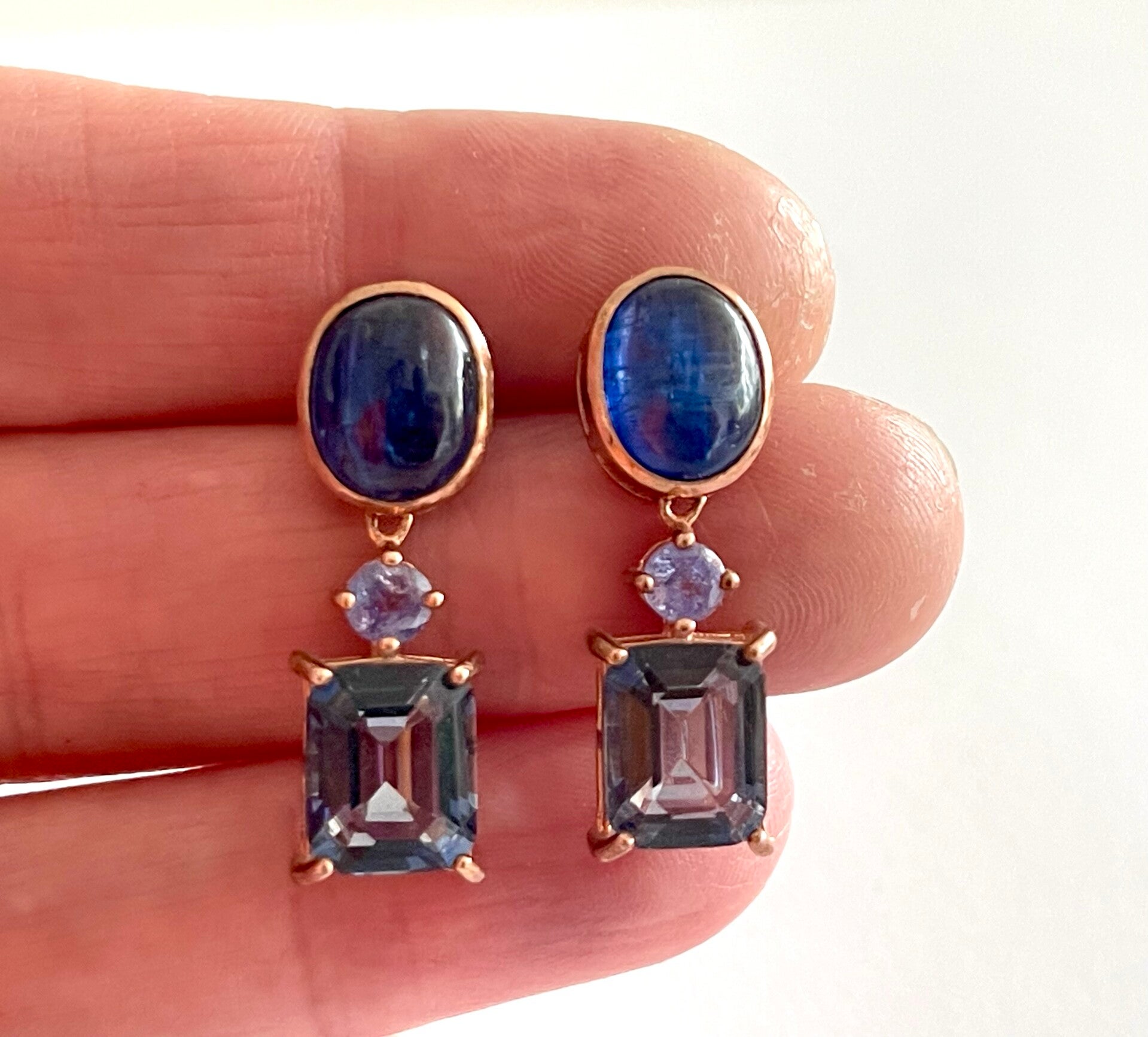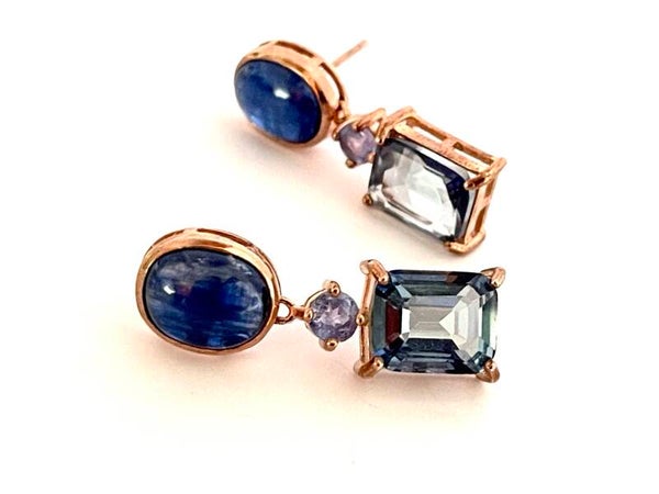 Deze prachtige Roségoud vergulde Zilveren oorbellen zijn bezet met Blauwe Saffier, Tanzaniet en Ioliet