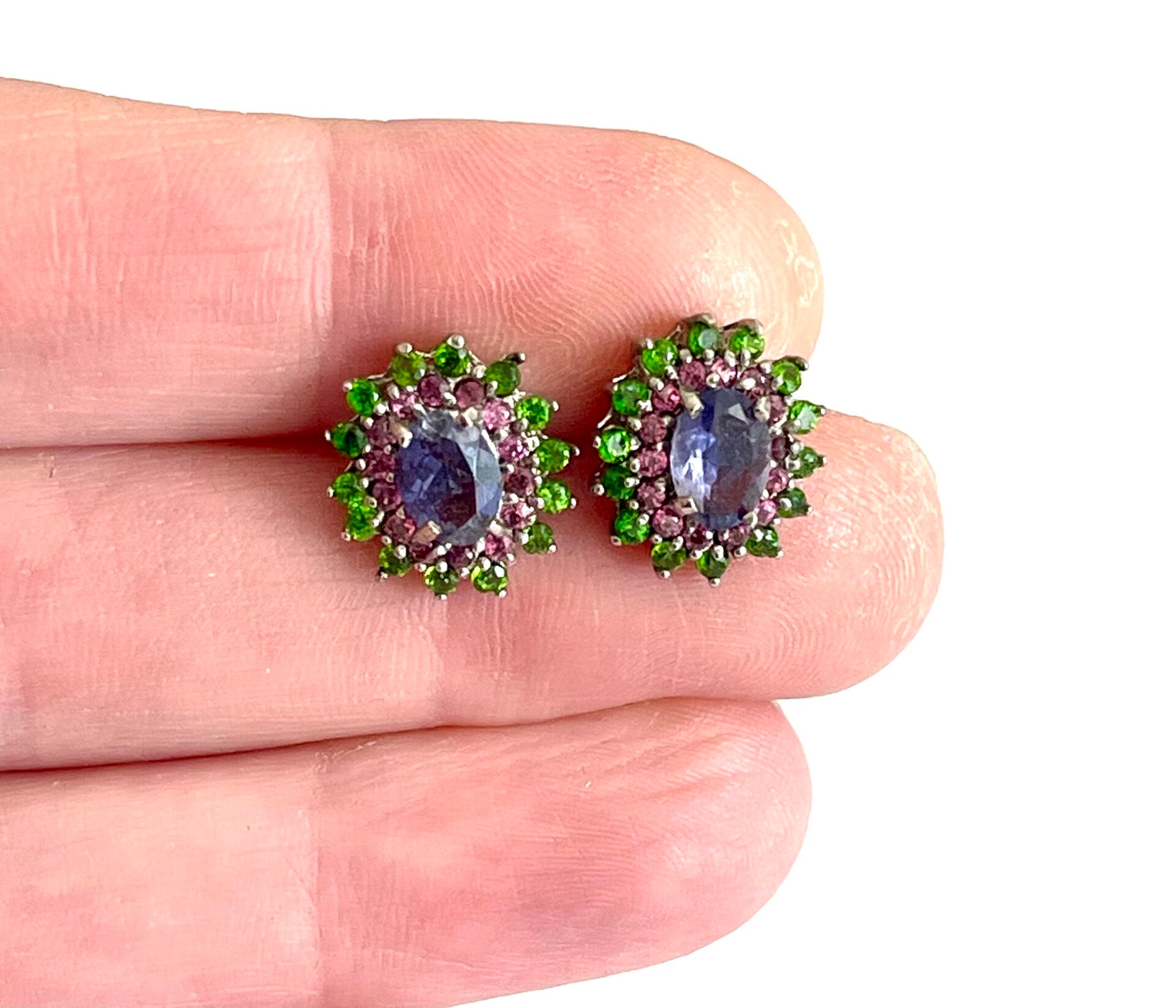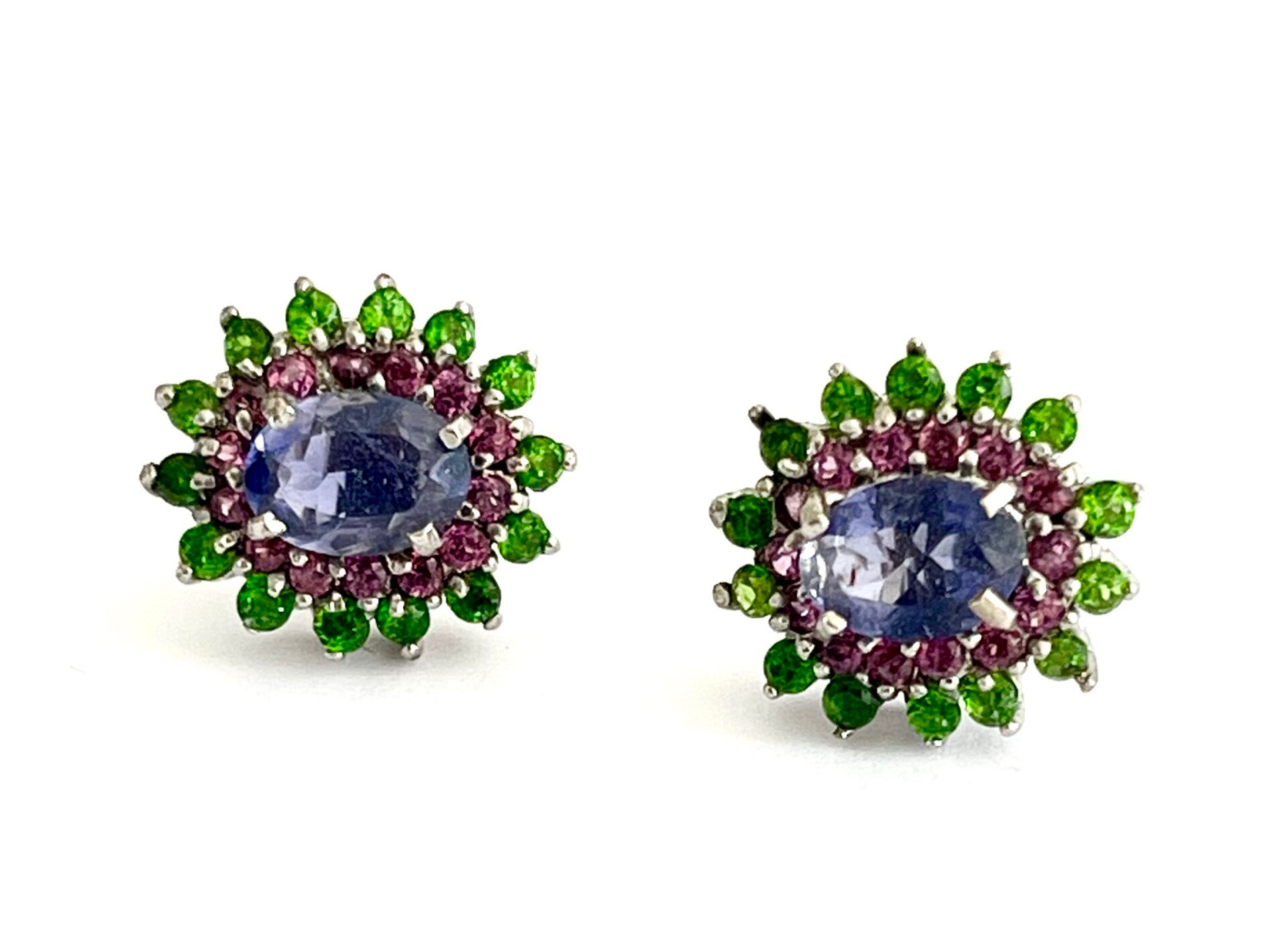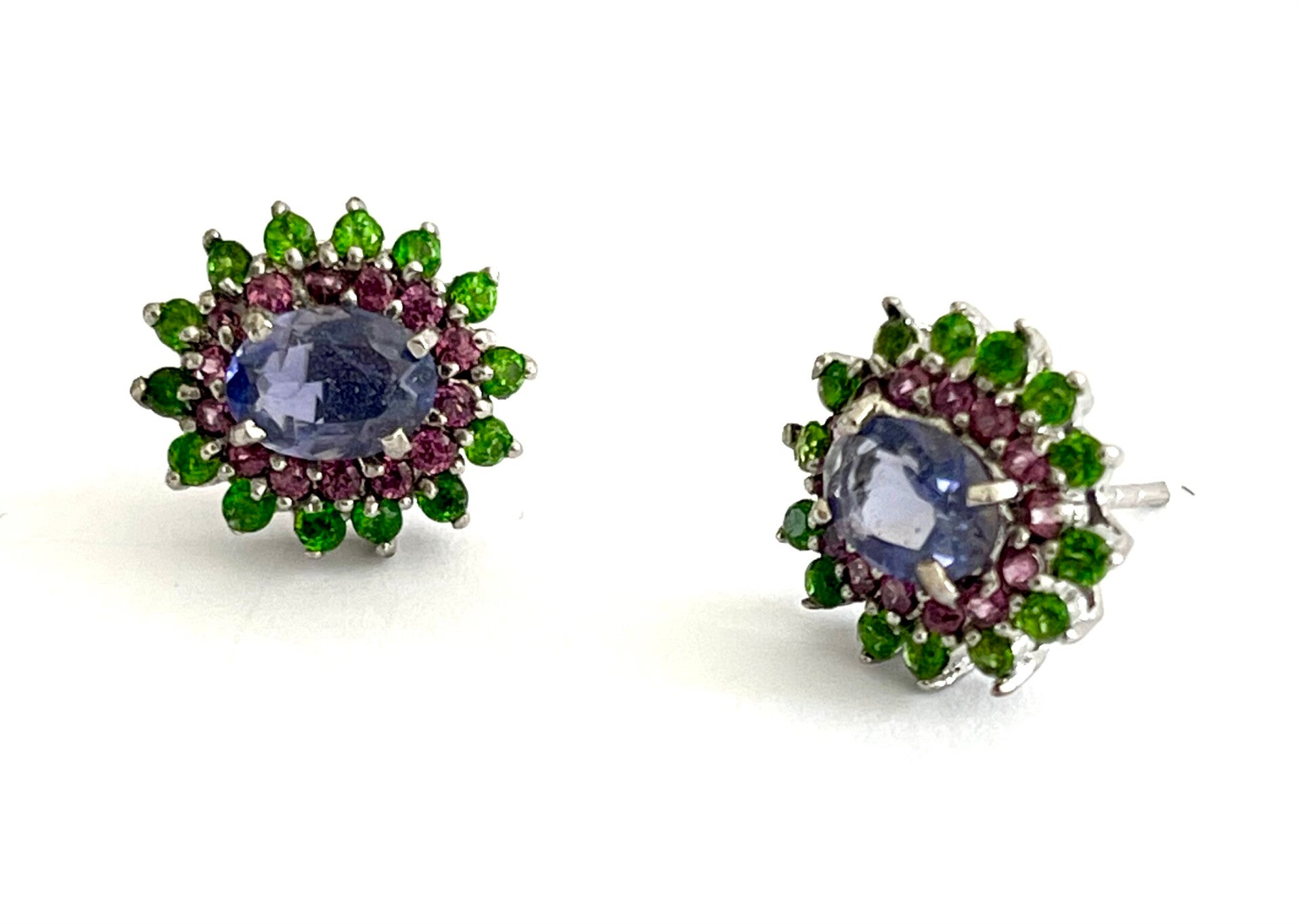 Deze prachtige oorbellen zijn bezet met Ioliet, Chromium Diopside en Rhodoliet.
