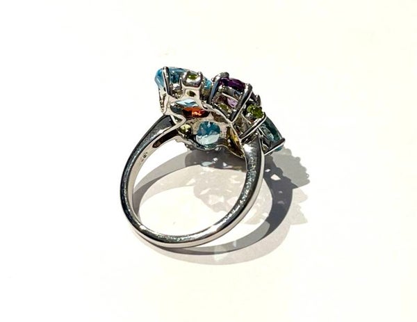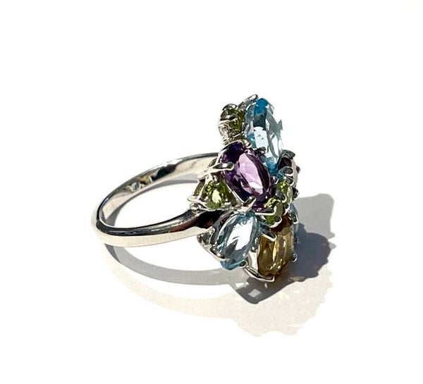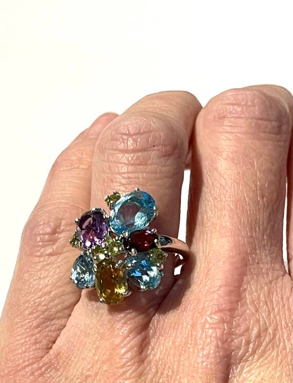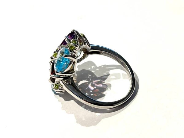 Deze prachtige zilvere Multicolor ring is bezet met onder anderen Swiss blue Topaas, Amethist, Citrien, Granaat en Peridoot