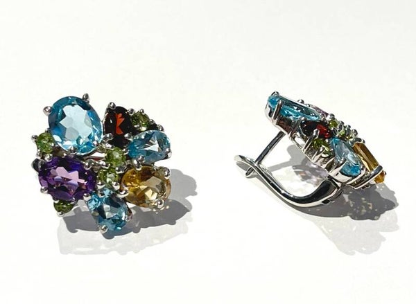 Deze prachtige oorbellen zijn bezet met Swiss Blue Topaas, Amethist, Citirien, Granaat en Peridoot