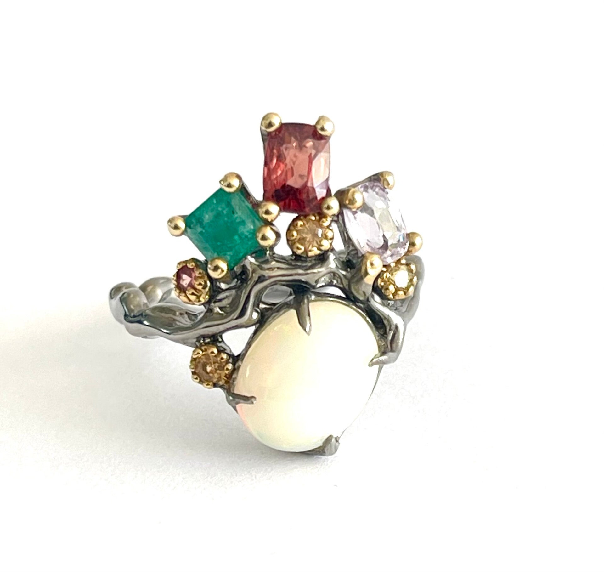 Zilveren ring met Opal, Citrine, Emerald en Tourmaline