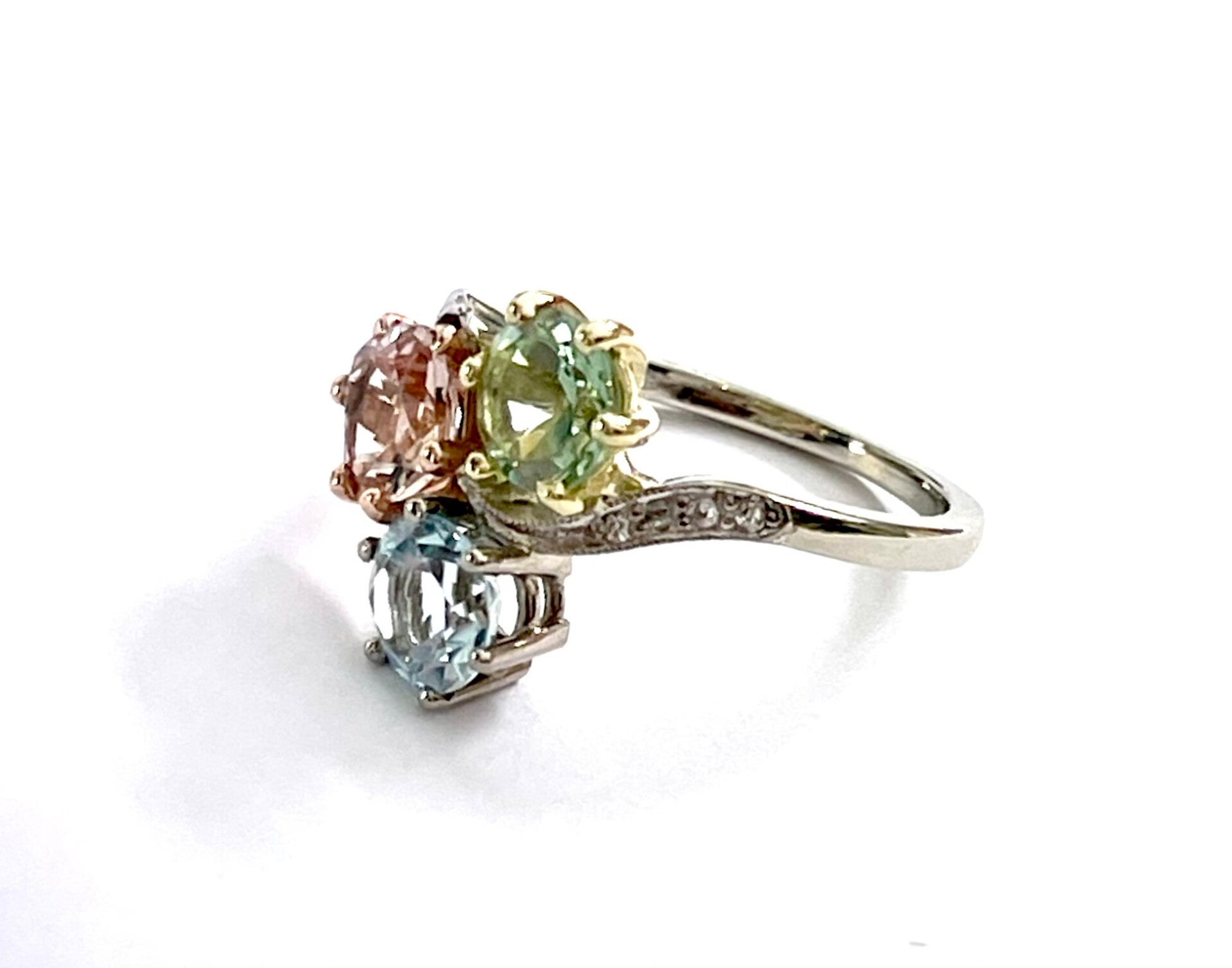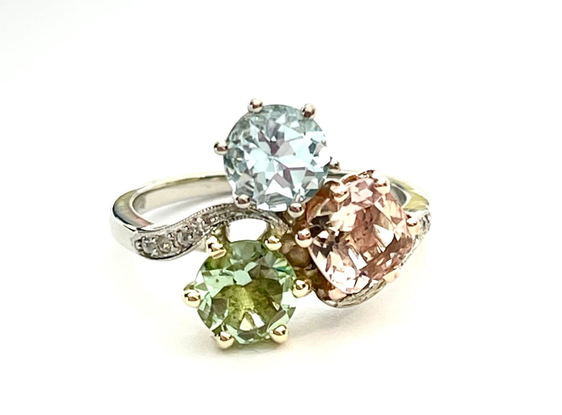 Edelstenen: Prasolite, Aquamarine, Morganite en Diamond +/- 0.05 ct.