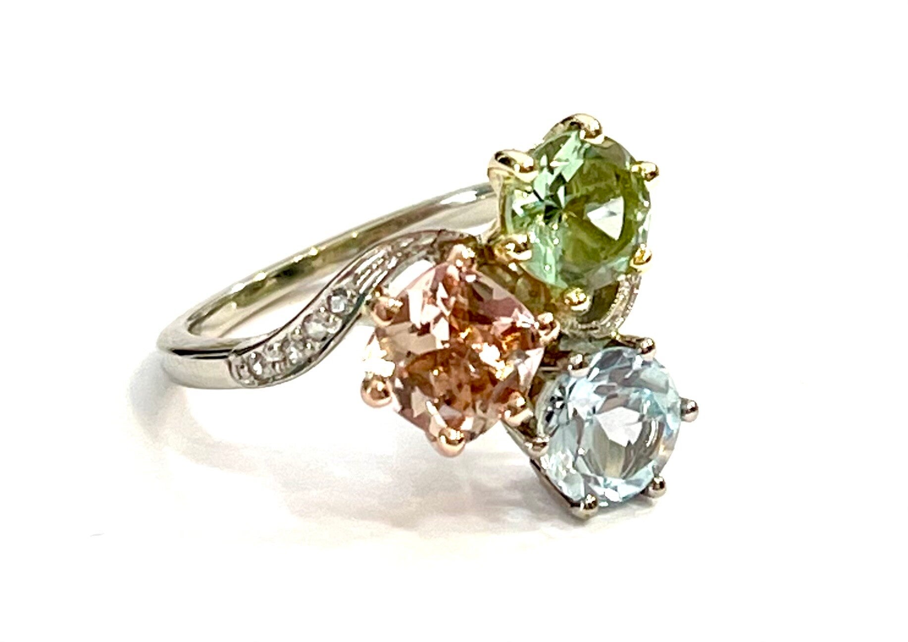 Deze prachtige handvervaardigde 14 krt Witgouden ring is bezet met Prasoliet, Aquamarijn, Morganiet en Diamant.