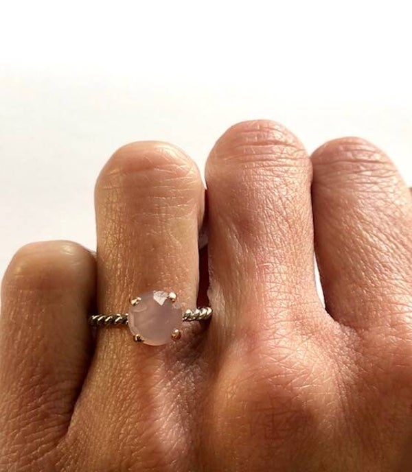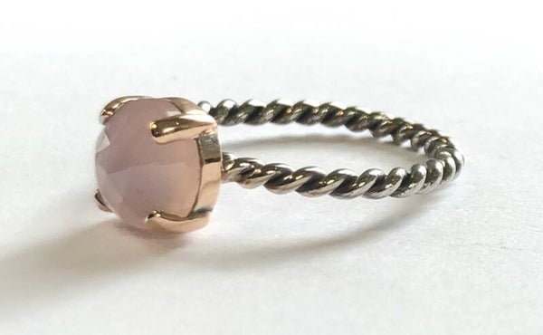 Deze prachtige handvervaardigde Witgouden ring met Roségouden zetting is bezet met Pink Chalcedony behoort tot onze Rosita's Mix collectie.