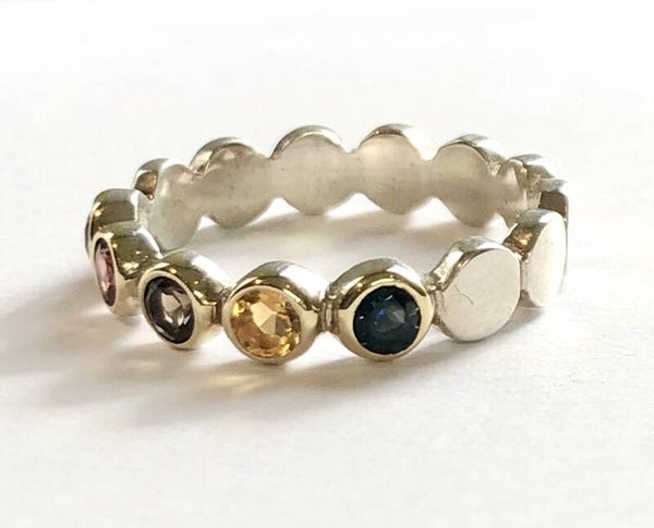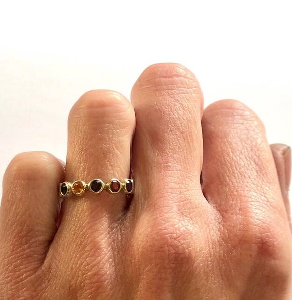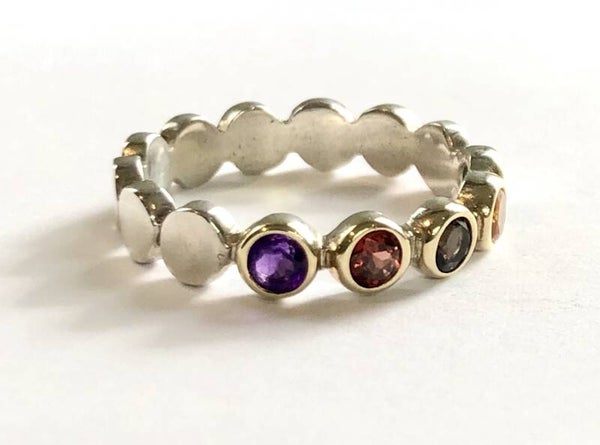 Deze prachtige handvervaardigde Zilver met Geelgouden ring bezet met Amethyst, Garnet, Smokey Quartz, Citrine en Tourmaline behoort tot onze Rosita's Mix collectie.