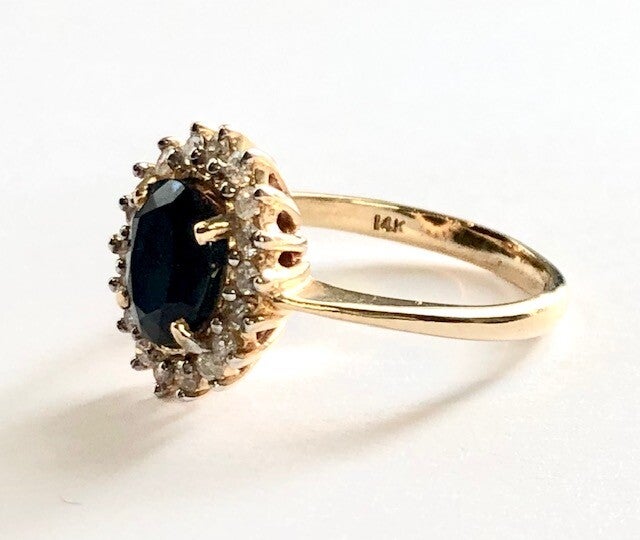Deze prachtige 14 krt Geelgouden Lady Diana ring is bezet met Saffier en 18 Diamanten.