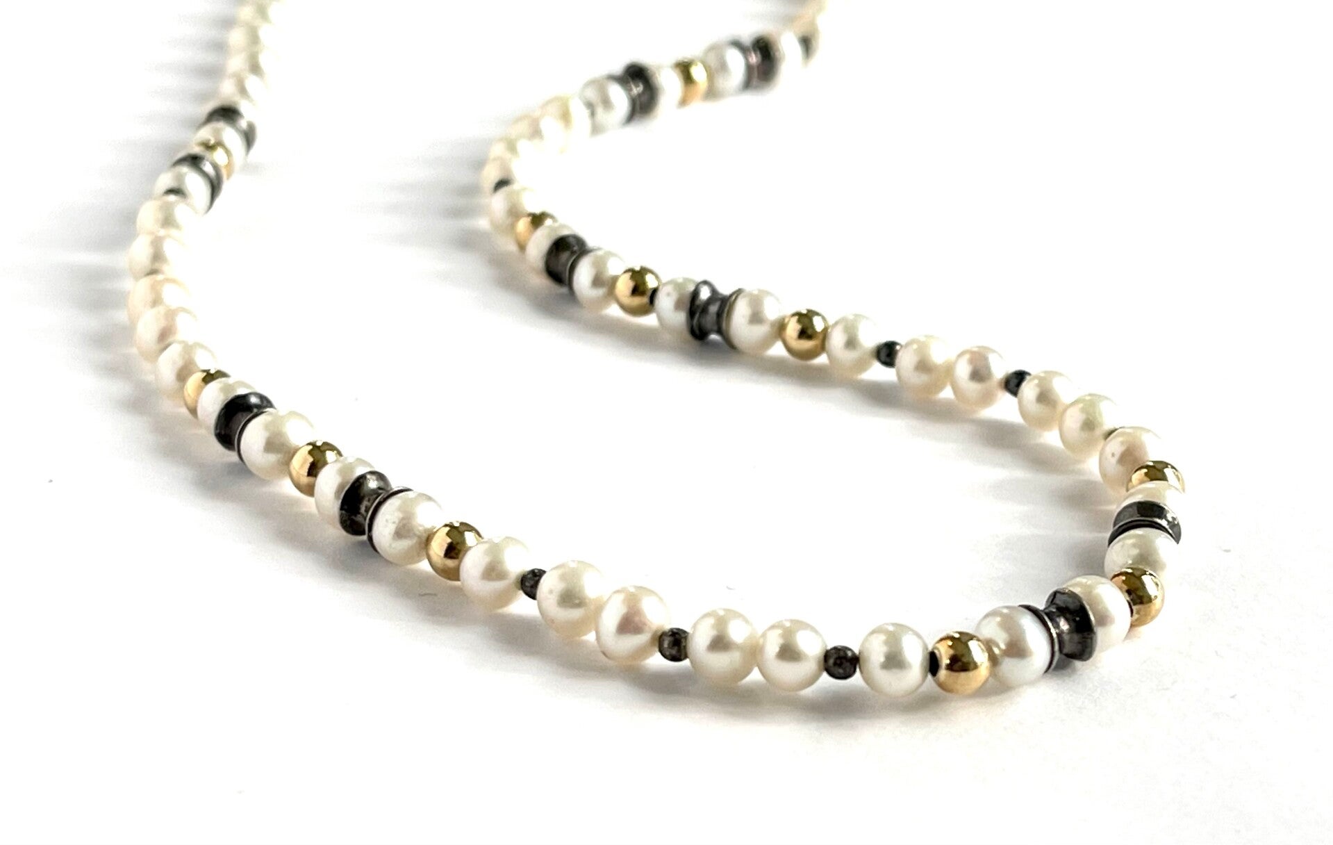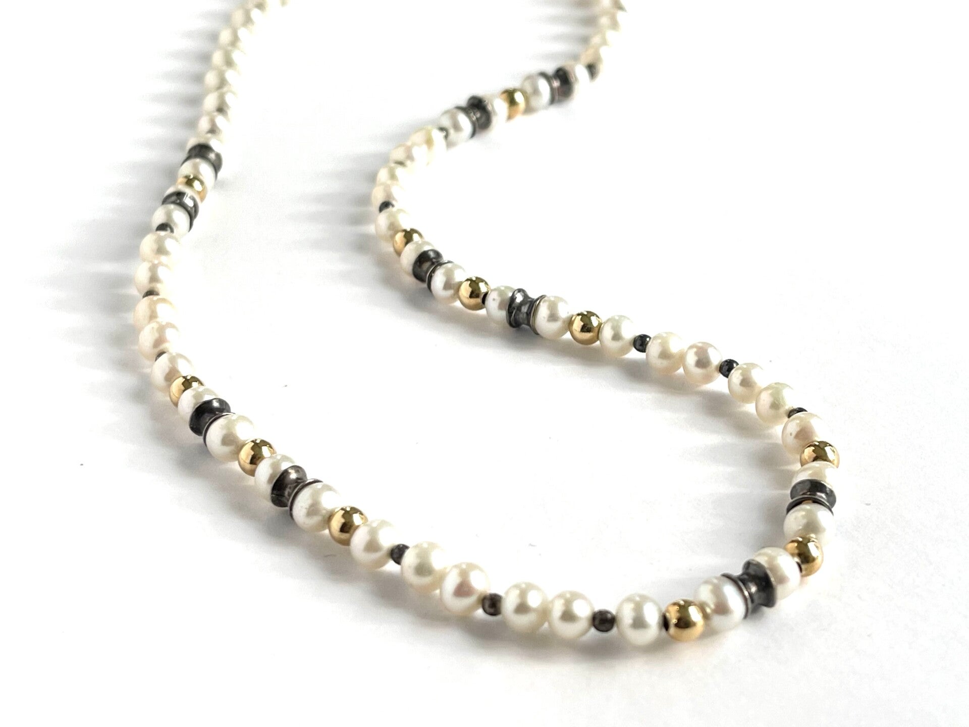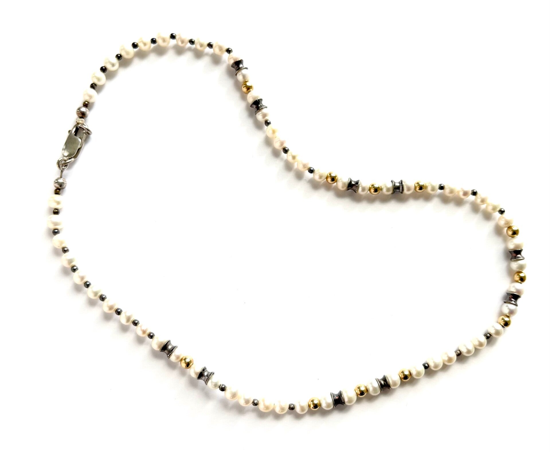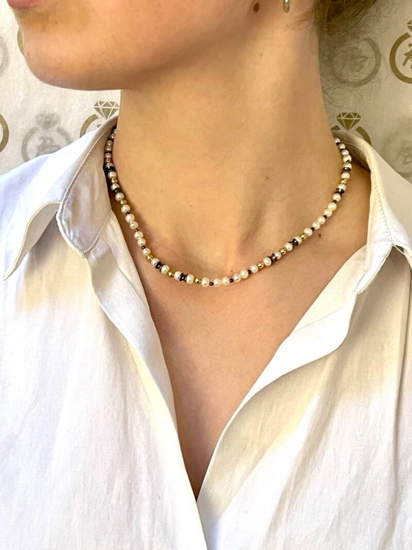 Prachtig Zoetwaterparel collier met zilveren details en Geelgouden ballen.