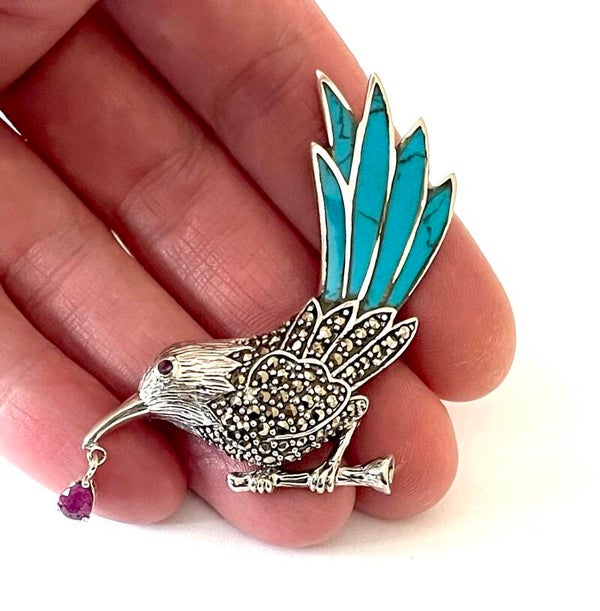 Zilveren broche met Turkoois, Marqesuite, Robijn