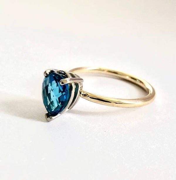Deze prachtige handvervaardigde Geelgouden ring bezet met een peer geslepen London Bue Topaz behoort tot onze Rosita's Mix collectie.