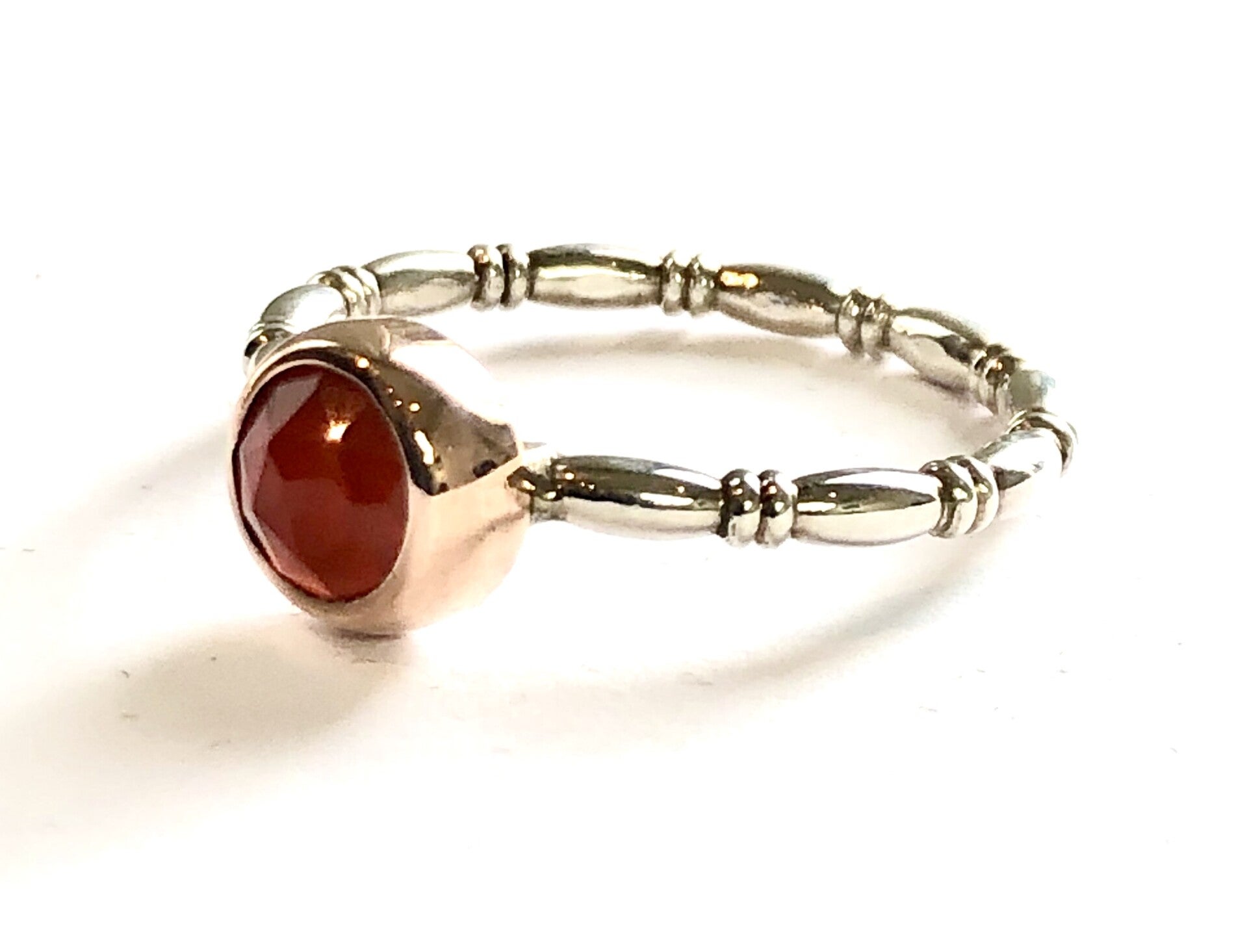 Deze prachtige handvervaardigde Zilveren ring met Roségouden zetting is bezet met een Carneol en behoort tot onze Rosita's Mix collectie.