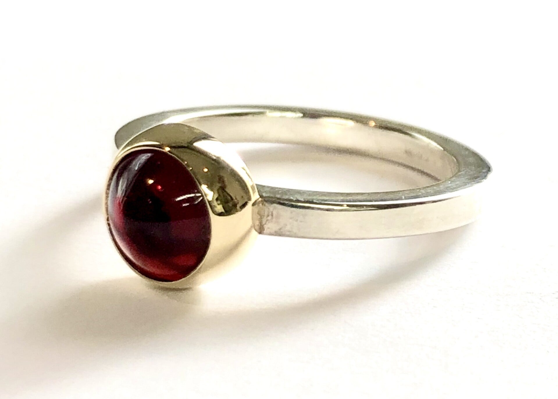 Deze prachtige handvervaardigde Zilveren ring met Geelgouden zetting is bezet met een Garnet en behoort tot onze Rosita's Mix collectie.