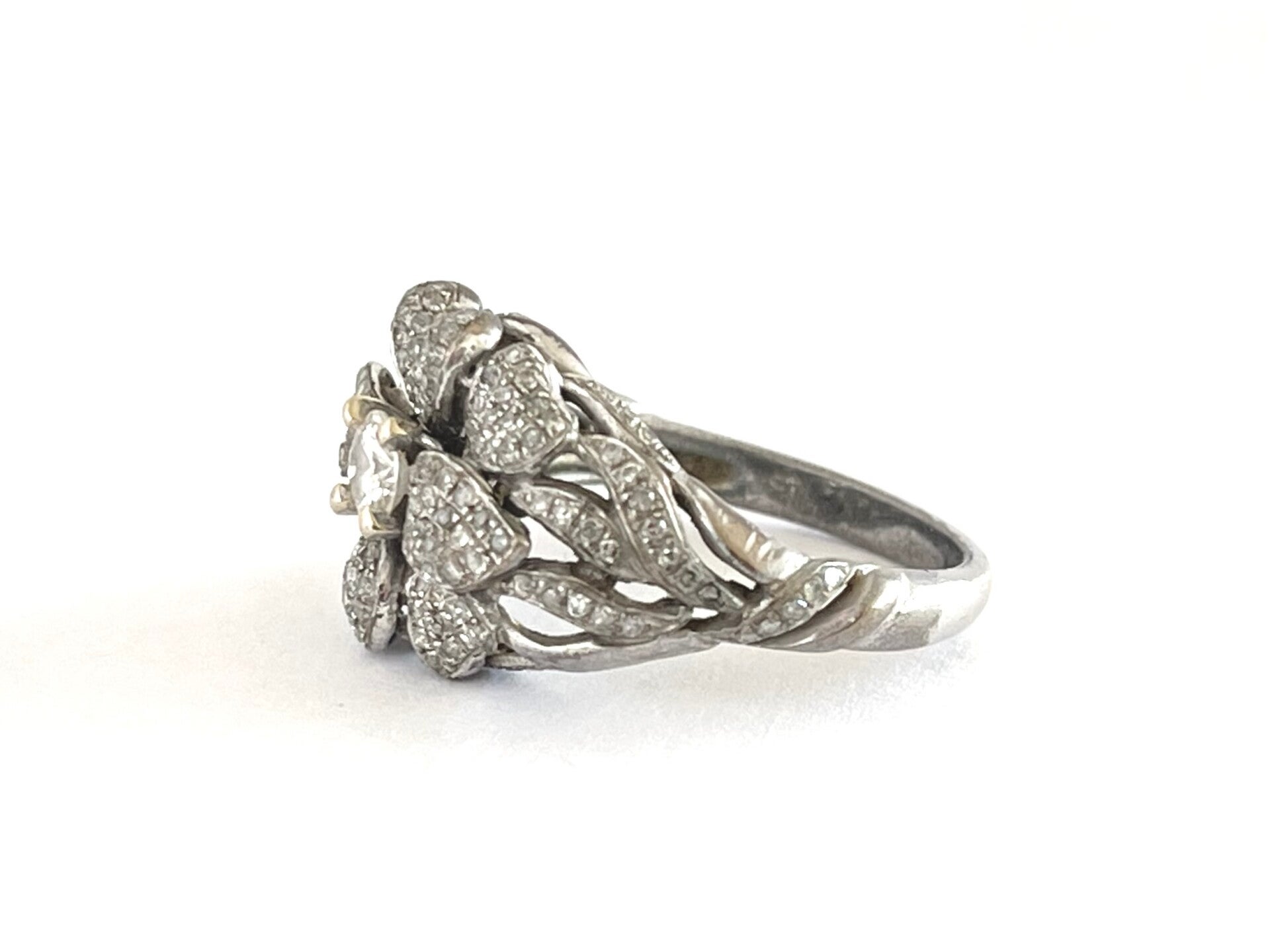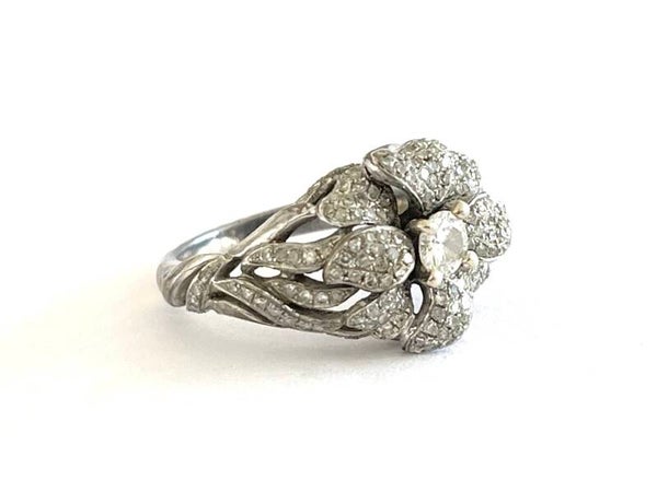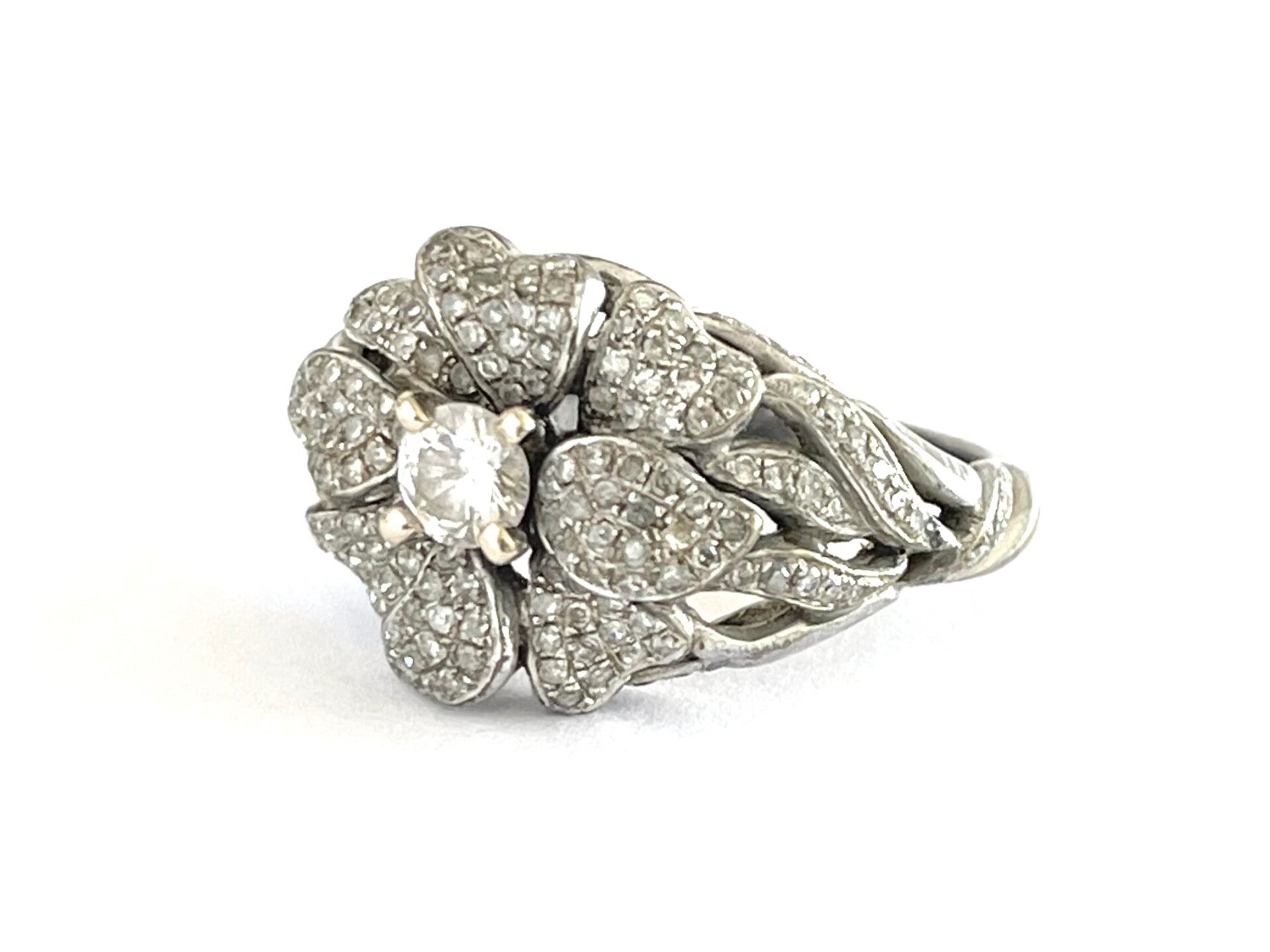 Deze prachtige vintage 14 krt Witgouden ring is bezet met Diamanten.