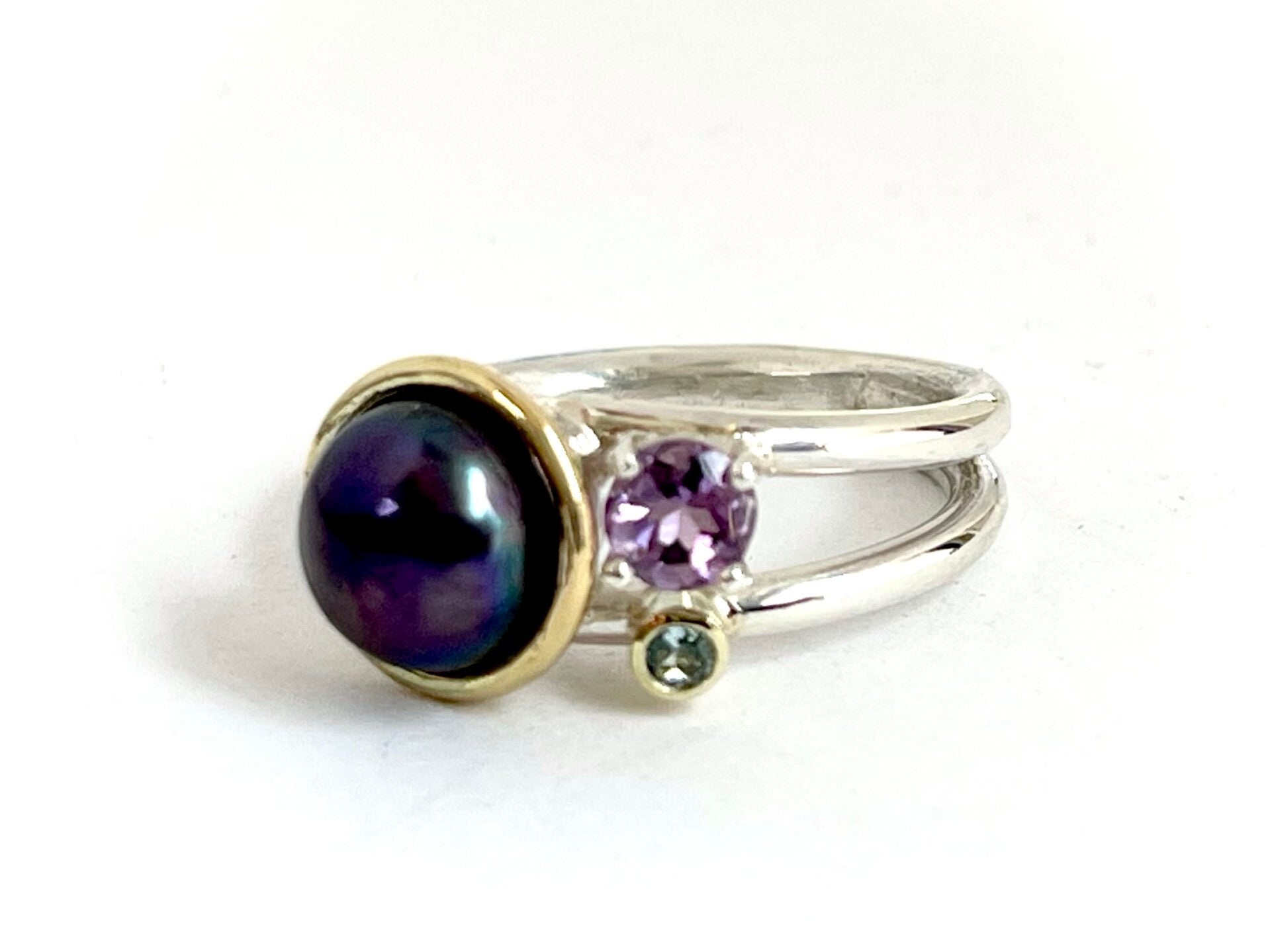 Deze prachtige handvervaardigde zilver met gouden ring bezet met Amethist en Sky Blue Topaas en een prachtige paarse zoetwater parel.