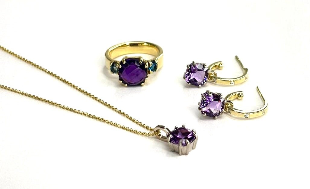 Prachtige 14 karaats handvervaardigde Geelgouden Amethist creoolhangers.