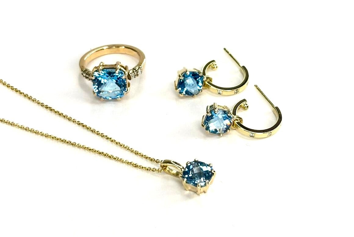 Prachtige handvervaardigden Geelgouden Hanger Huggs met Swiss blue topaas