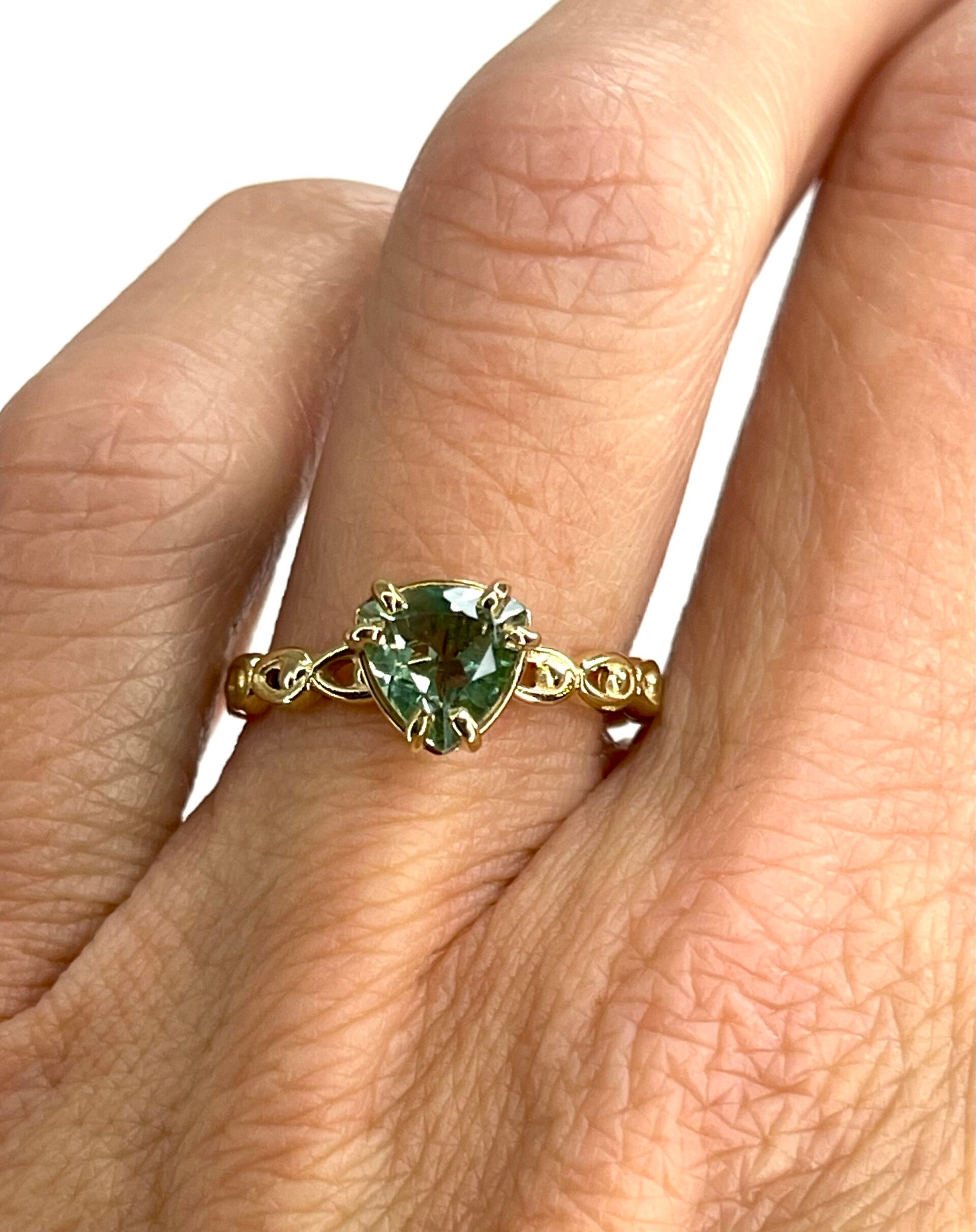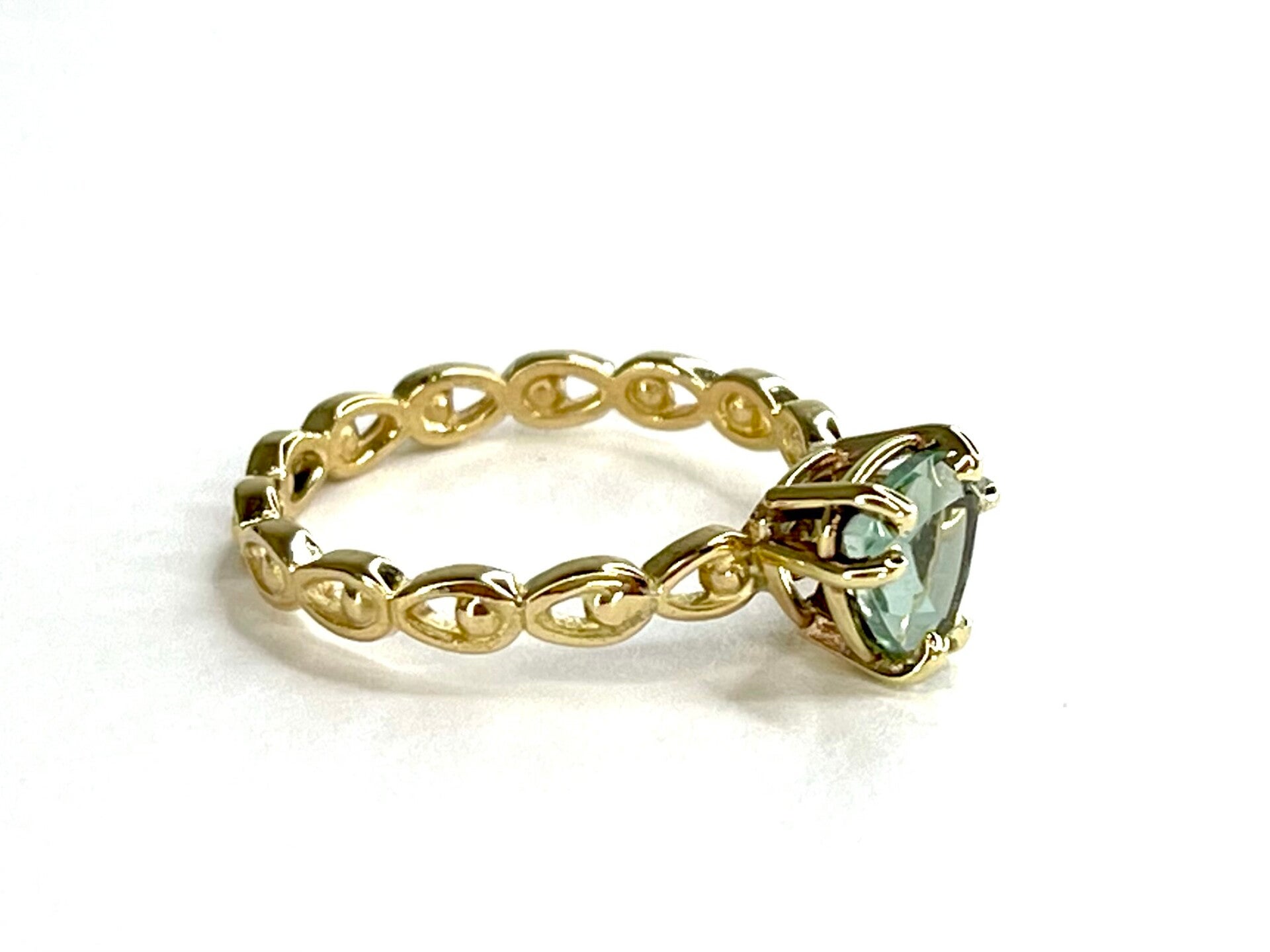 Deze prachtige handvervaardigde Geelgouden ring bezet met Prasioliet behoort tot onze Rosita's Mix collectie.