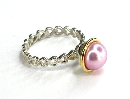 Deze prachtige handvervaardigde Zilveren met Geelgouden ring met een Roze Parel behoort tot onze Rosita's Mix collectie.