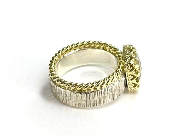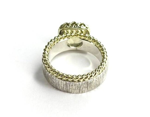 Deze schitterende handvervaardigde zilver en geelgouden ring met Peridot behoort tot onze Joy collectie.