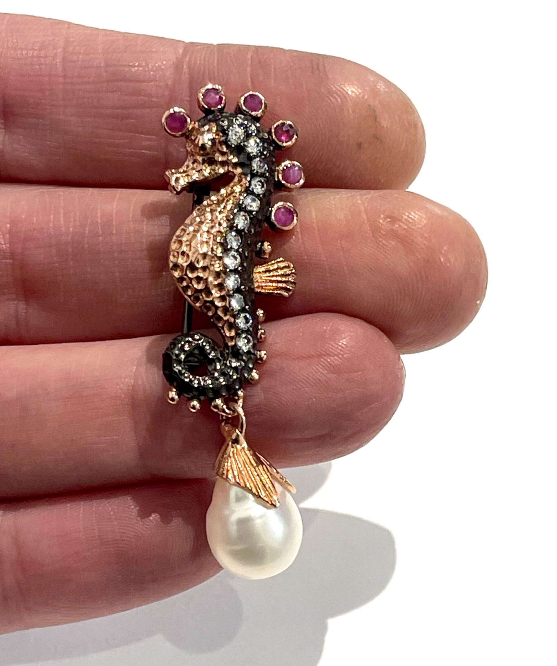 Zilveren Zwart geronideerd en Rosé verguld zeepaard broche met Parel, Robijn en Zirkonia