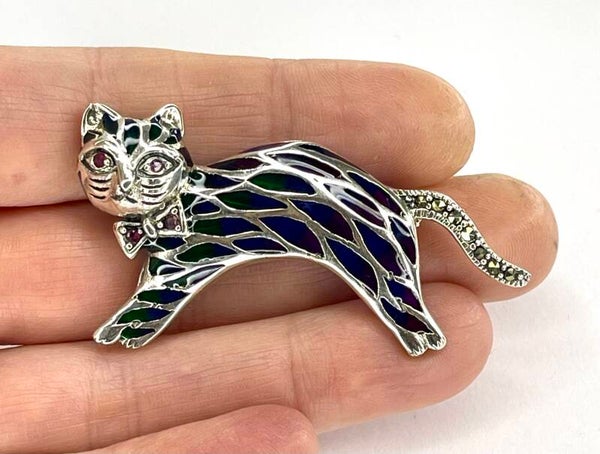 Prachtige zilveren katten broche met Emaille en Robijn.