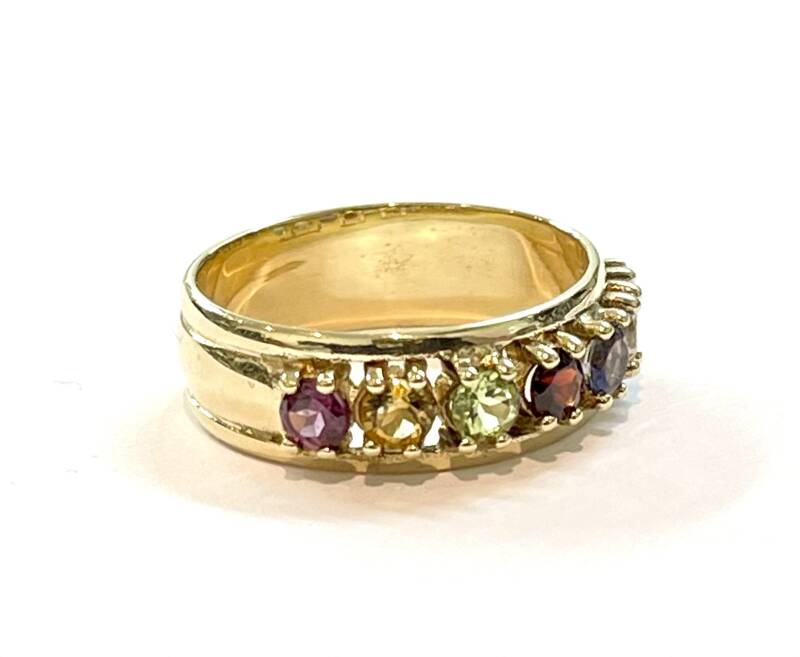 Deze prachtige handvervaardigde Geelgouden ring is bezet met Rhodoliet, Citrine, Peridot, Granaat, Iolite, Wit Topaas en Blauw Topaas.