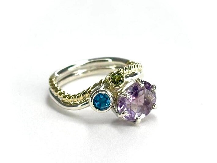 Deze prachtige handvervaardigde Geelgouden en Zilveren ring is bezet met Amethist, Peridot en Blauw Topaas.