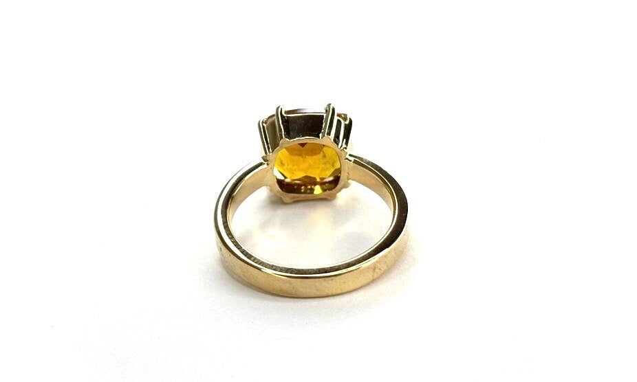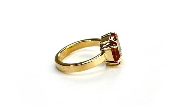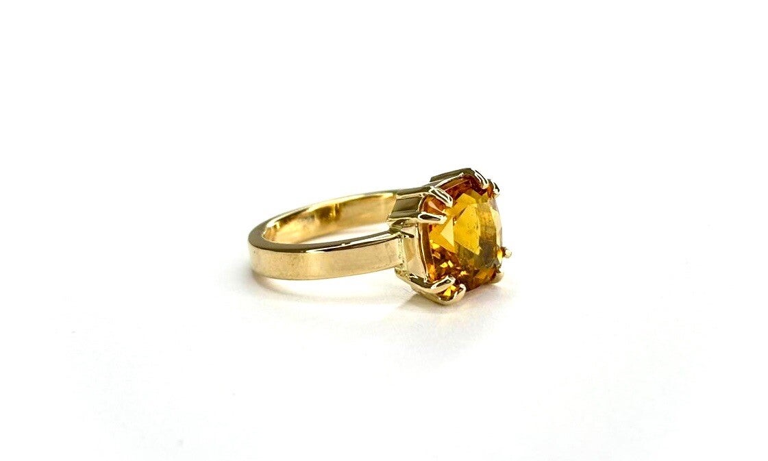 Deze prachtige handvervaardigde ring uit eigen atelier behoort tot onze Huggs & Kisses collectie. Deze Geelgouden ring heeft als topsteen een Madeira Citrine en aan weerszijden drie Diamanten.