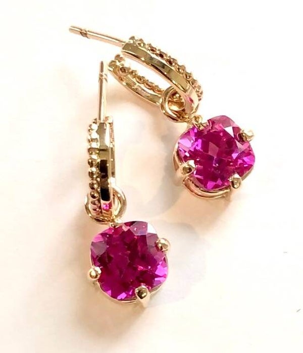 Prachtige 14 karaats Roségouden creolen, met Pink Sapphire creoolhangers.
