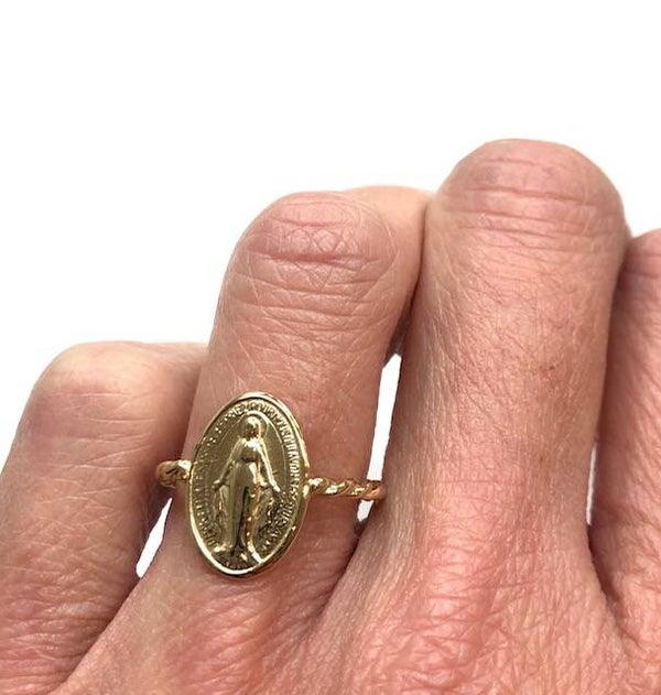 Handvervaardigde 14 karaats geelgouden tordeer ring met een Madonna muntje.