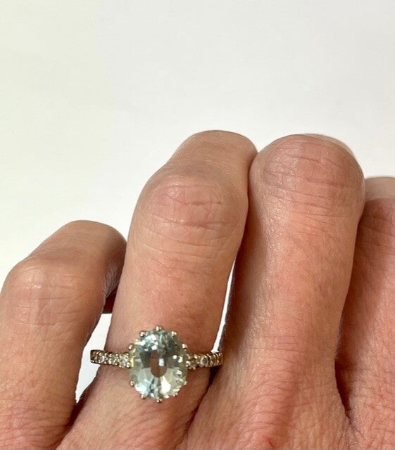 Deze prachtige hanvervaardigde 14 krt Geelgouden ring met witgouden zettigen is bezet met een ovale Aquamarijn en briljant geslepen Diamanten.