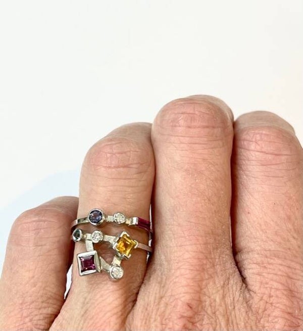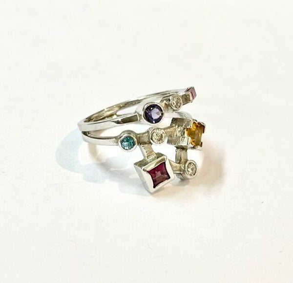 Deze schitterende handvervaardigde Witgouden ring met Diamanten, Citrine, Rhodoliet, Topaas, Ioliet en S. Robijn tot onze La Vie collectie.