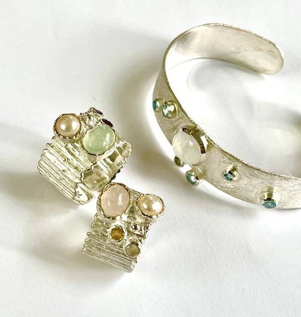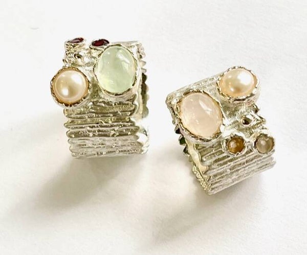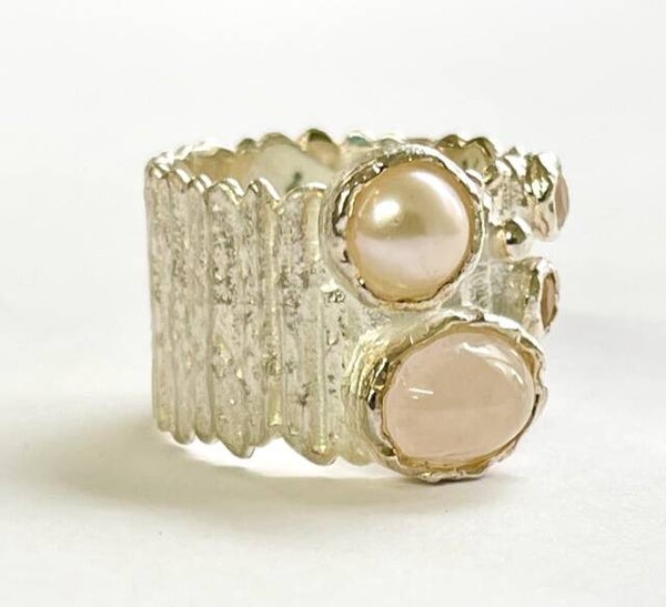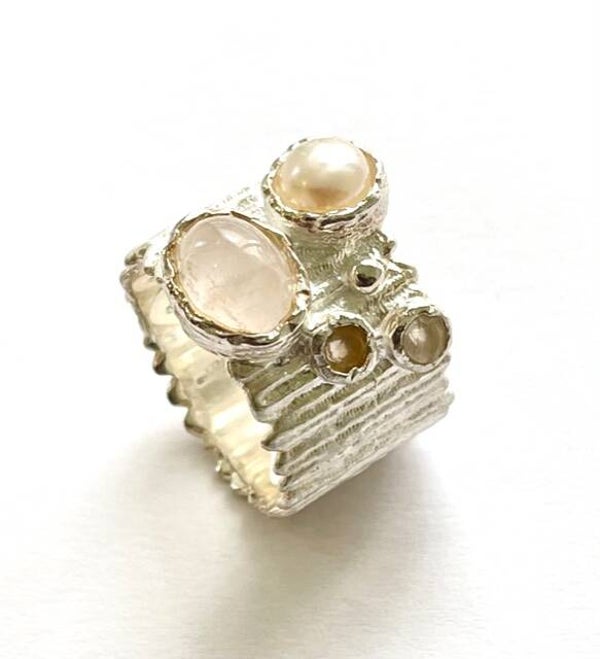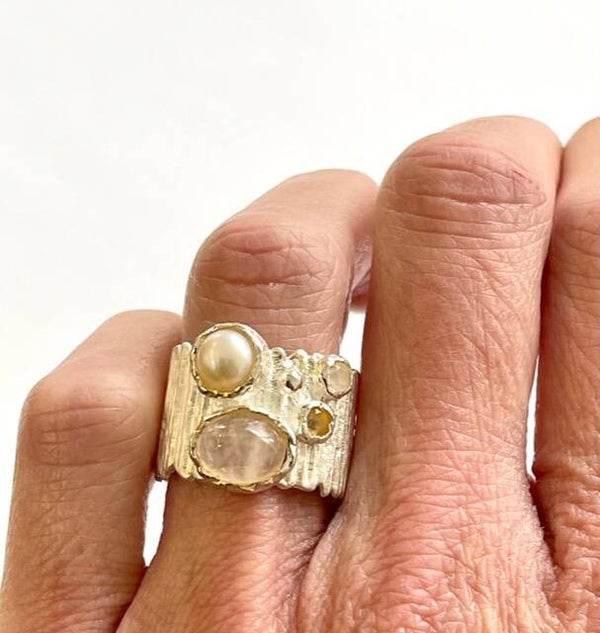 Deze prachtige zilveren ring met reliëf is bezet met Parel, Roze kwarts en Citrine.