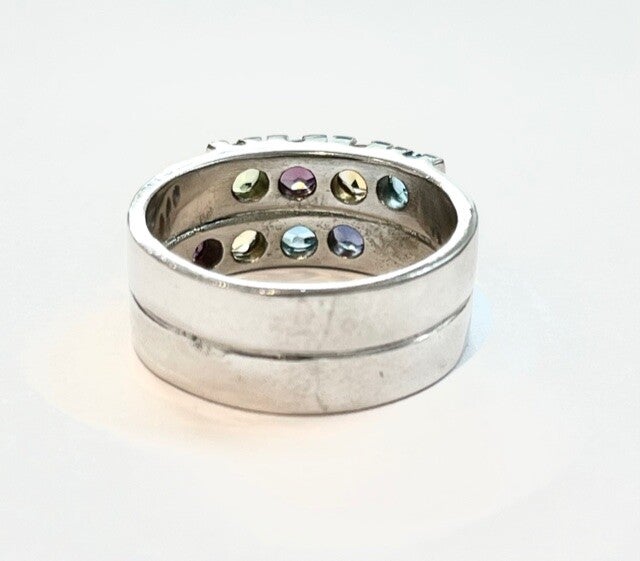 Deze prachtige handvervaardigde Zilveren ring is bezet met Citrine, Blauw Topaas, Iolite, Peridot, Rhodolite.