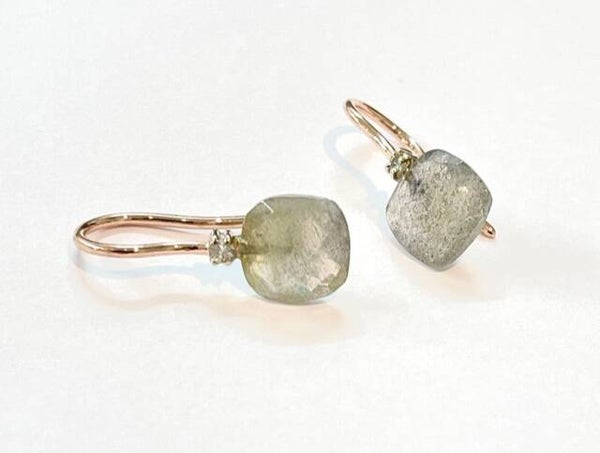 Prachtige handvervaardigden Roségouden Hollandse haken met Labradoriet en diamant.