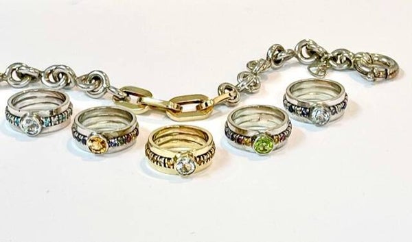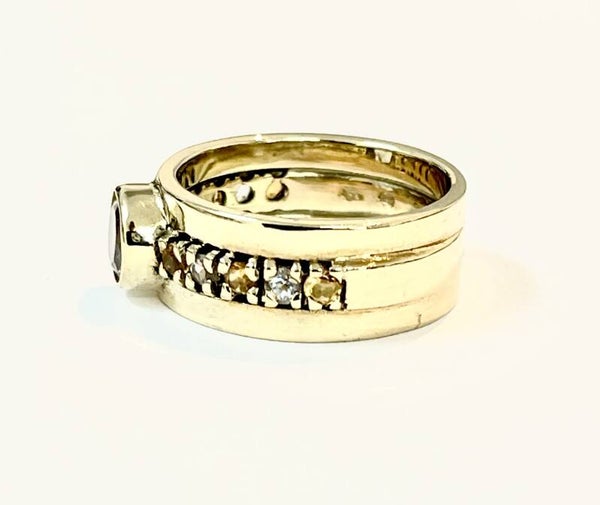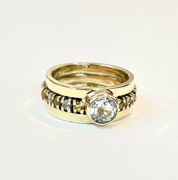 Deze prachtige 14 krt geelgouden handvervaardigde ring bezet met Wit Topaas en Citrine.