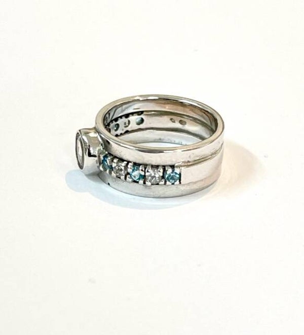 Deze prachtige Zilveren handvervaardigde ring bezet met Wit Topaas en Blauw Topaas