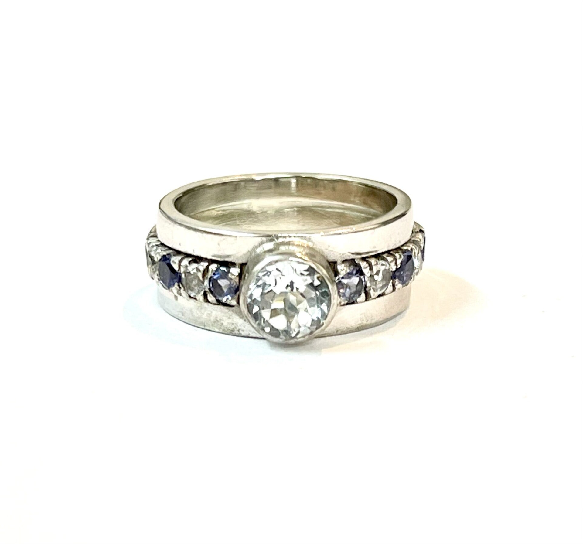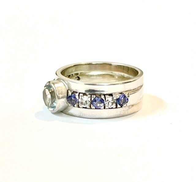 Deze prachtige Zilveren handvervaardigde ring bezet met Wit Topaas en Ioliet
