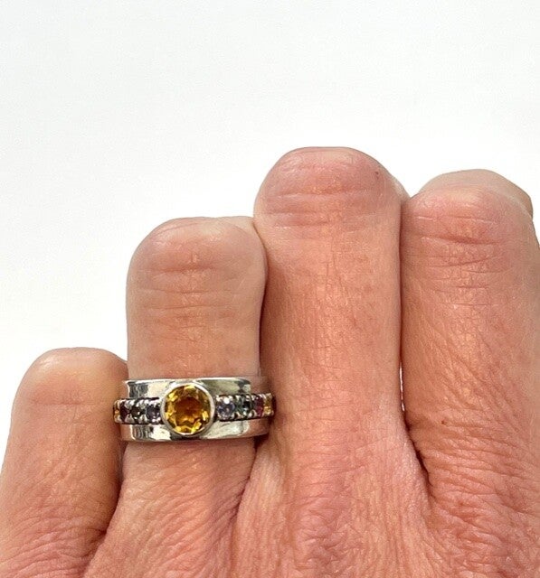 Deze prachtige Zilveren handvervaardigde ring bezet met Citrine, Ioliet, Tourmalijn, Roze Topaas, Citrine en Granaat