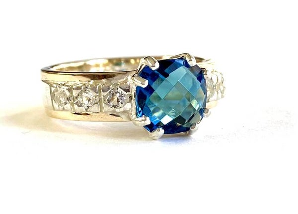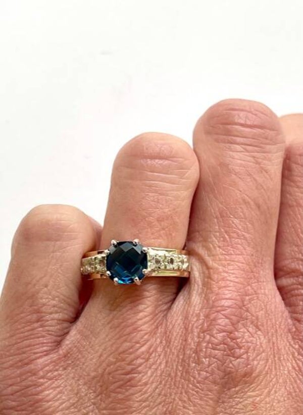 Deze prachtige handvervaardigde zilveren ring met Geelgouden banden is bezet met Blauwe Kwarts en Wit topaas en behoort tot onze Huggs collectie