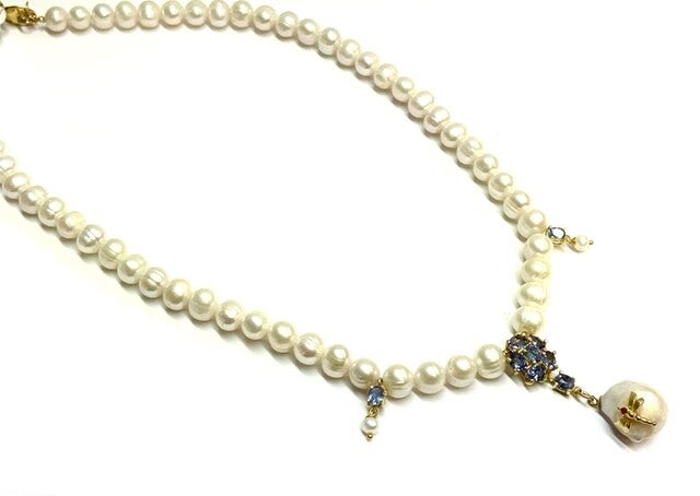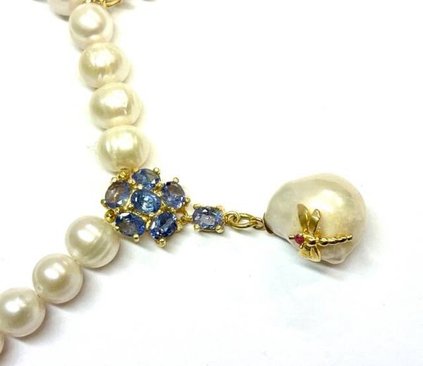 Deze Prachtige vergulden zilveren Parel collier met vergulde details is bezet met Ioliet, Robijn en een Barok Parel