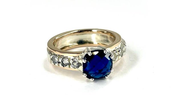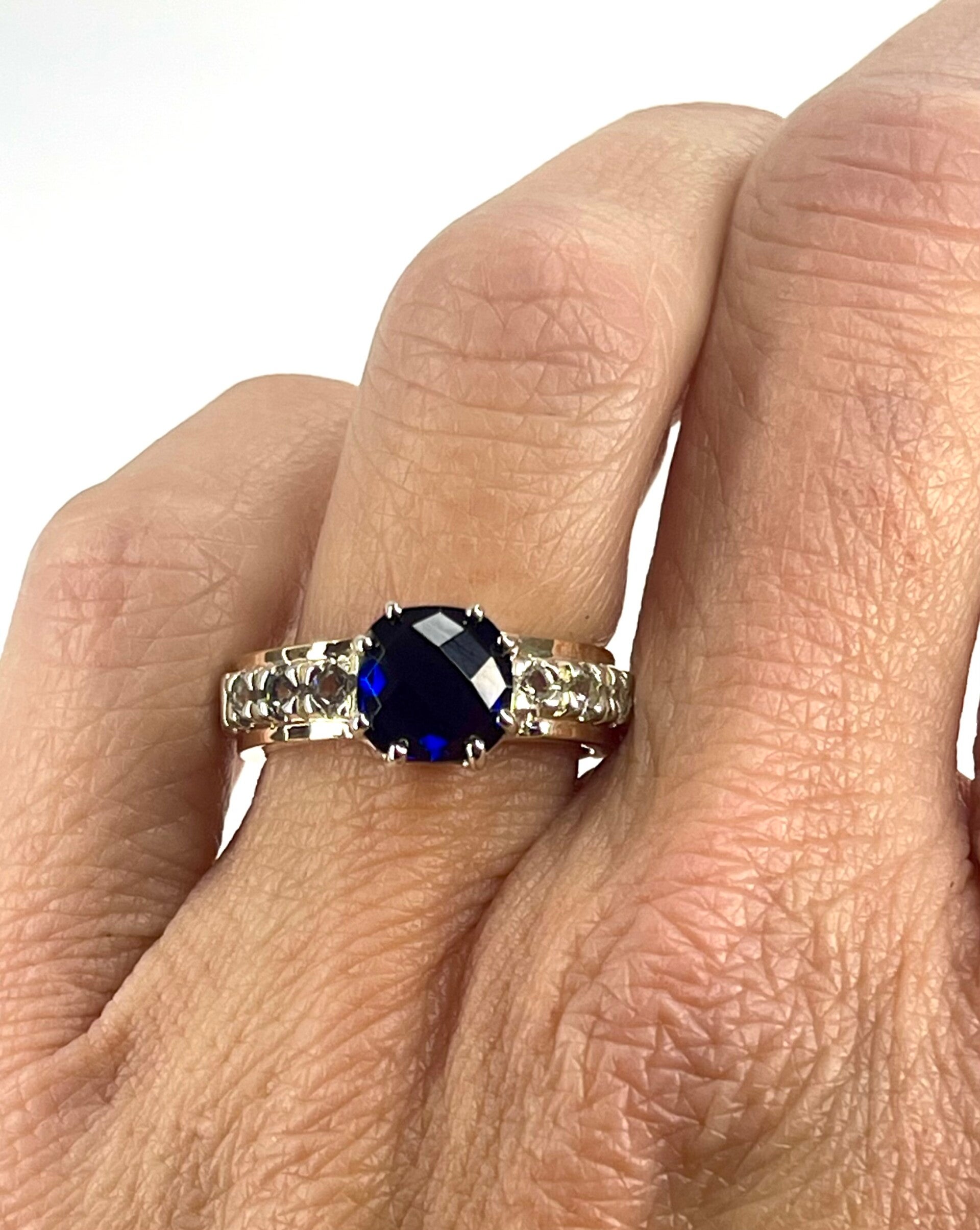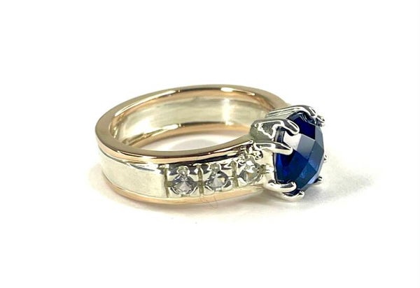 Deze prachtige handvervaardigde zilveren ring met Roségouden banden is bezet met wit spinel en een sapphire blue hydrokwarts.