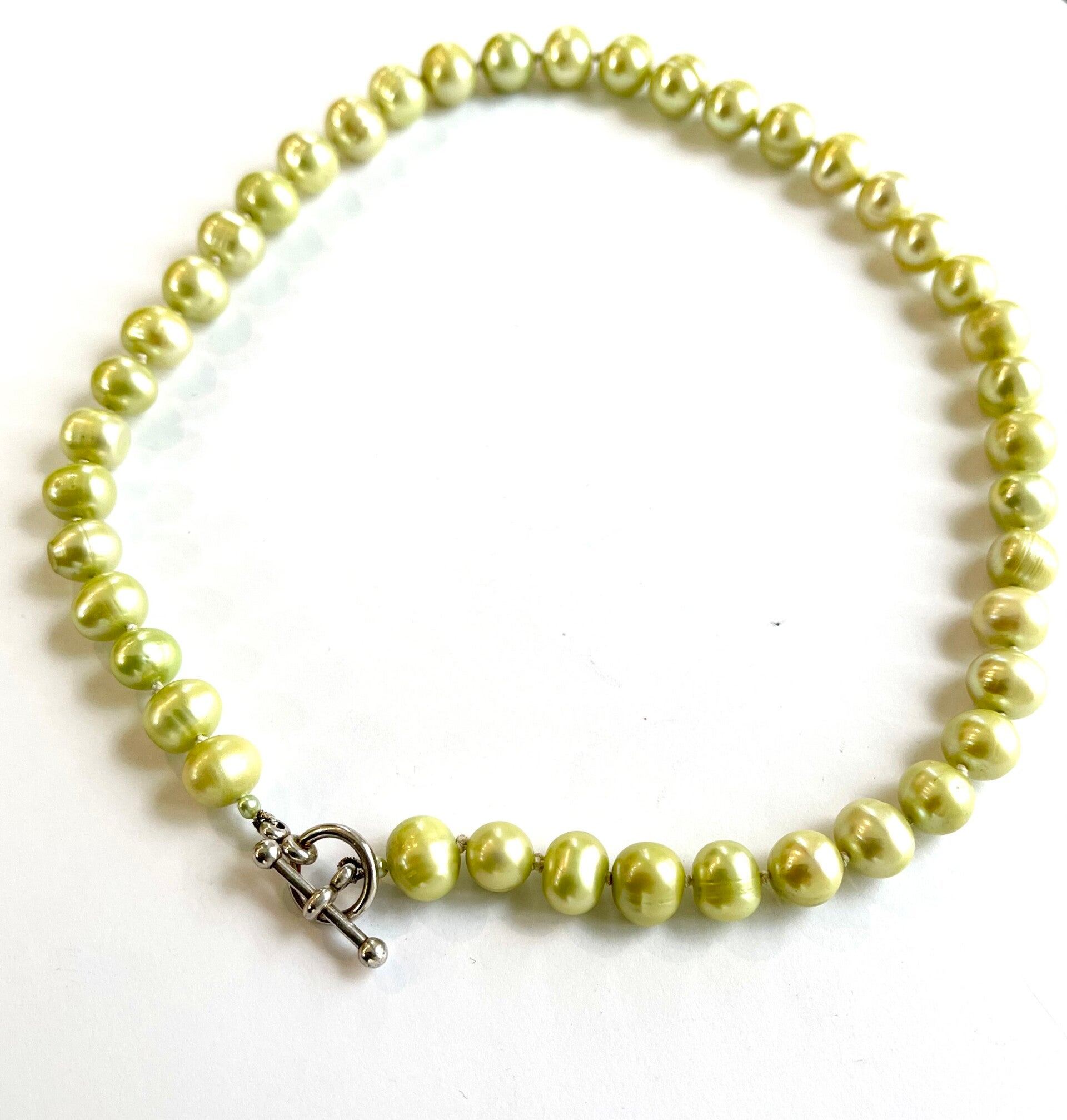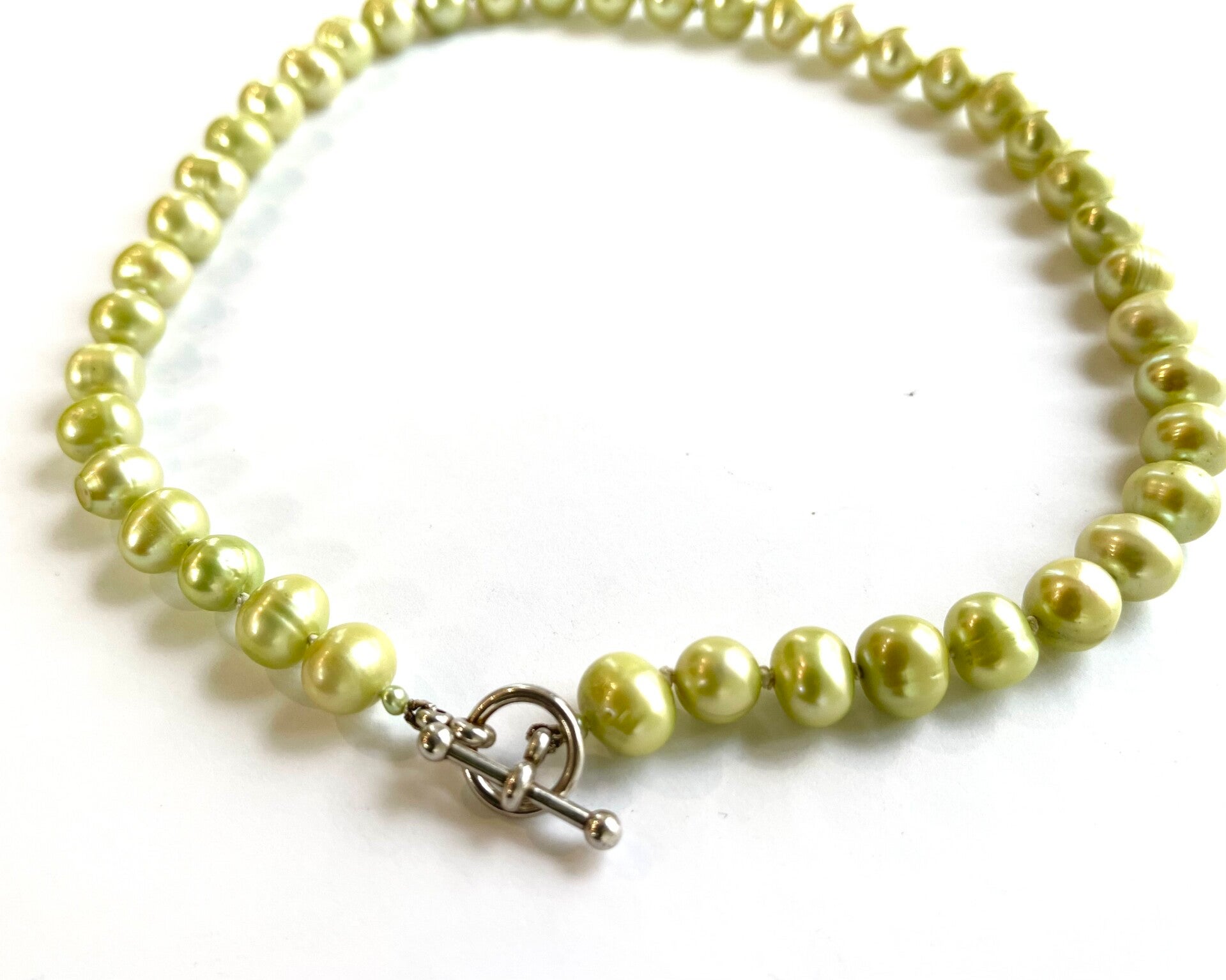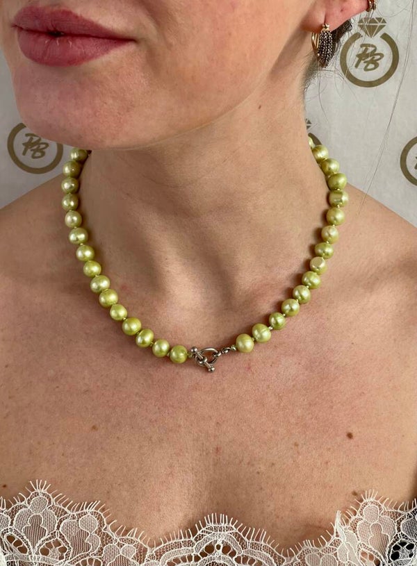 Prachtig groene Parel collier met een zilveren kapitelsluiting.
